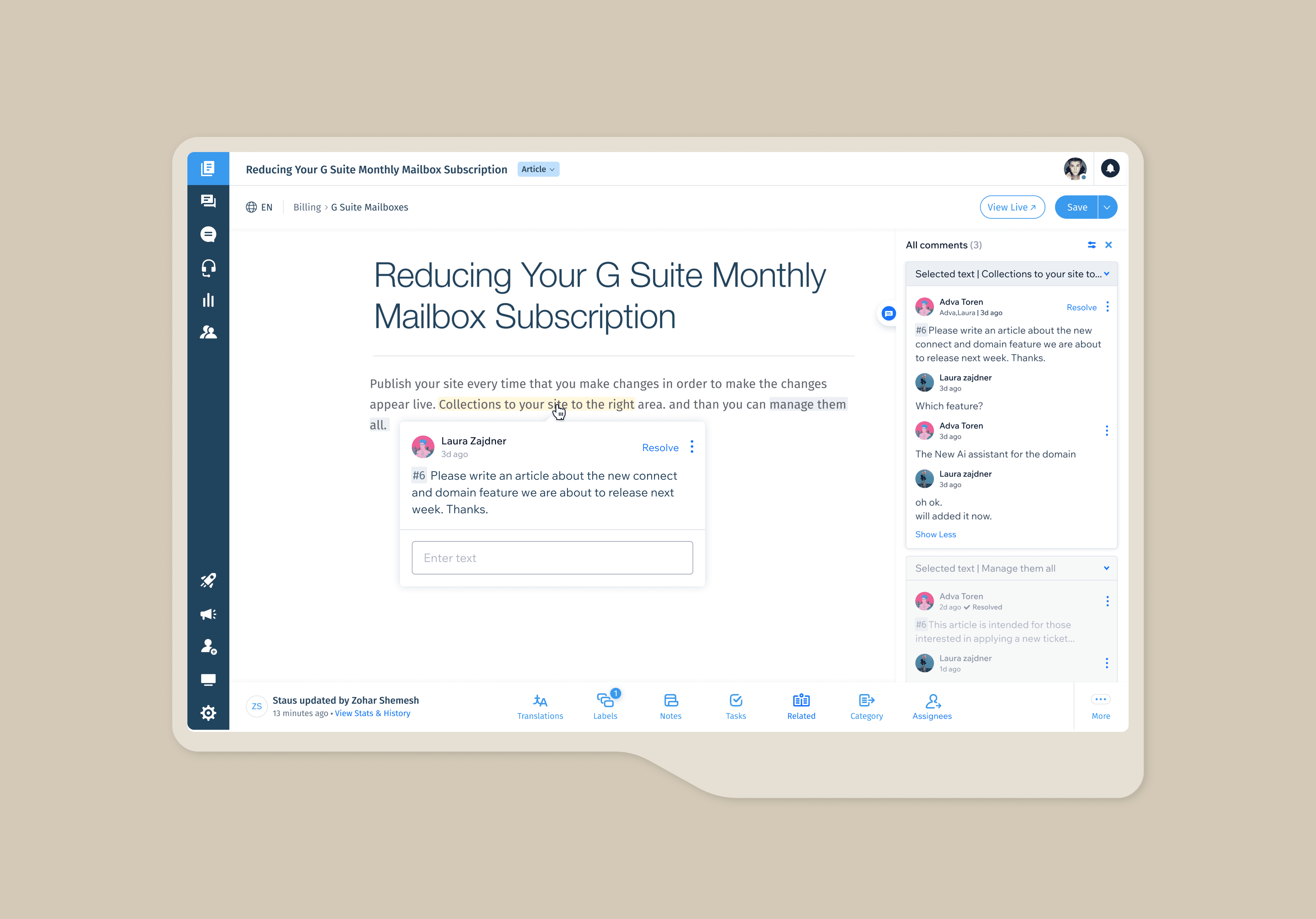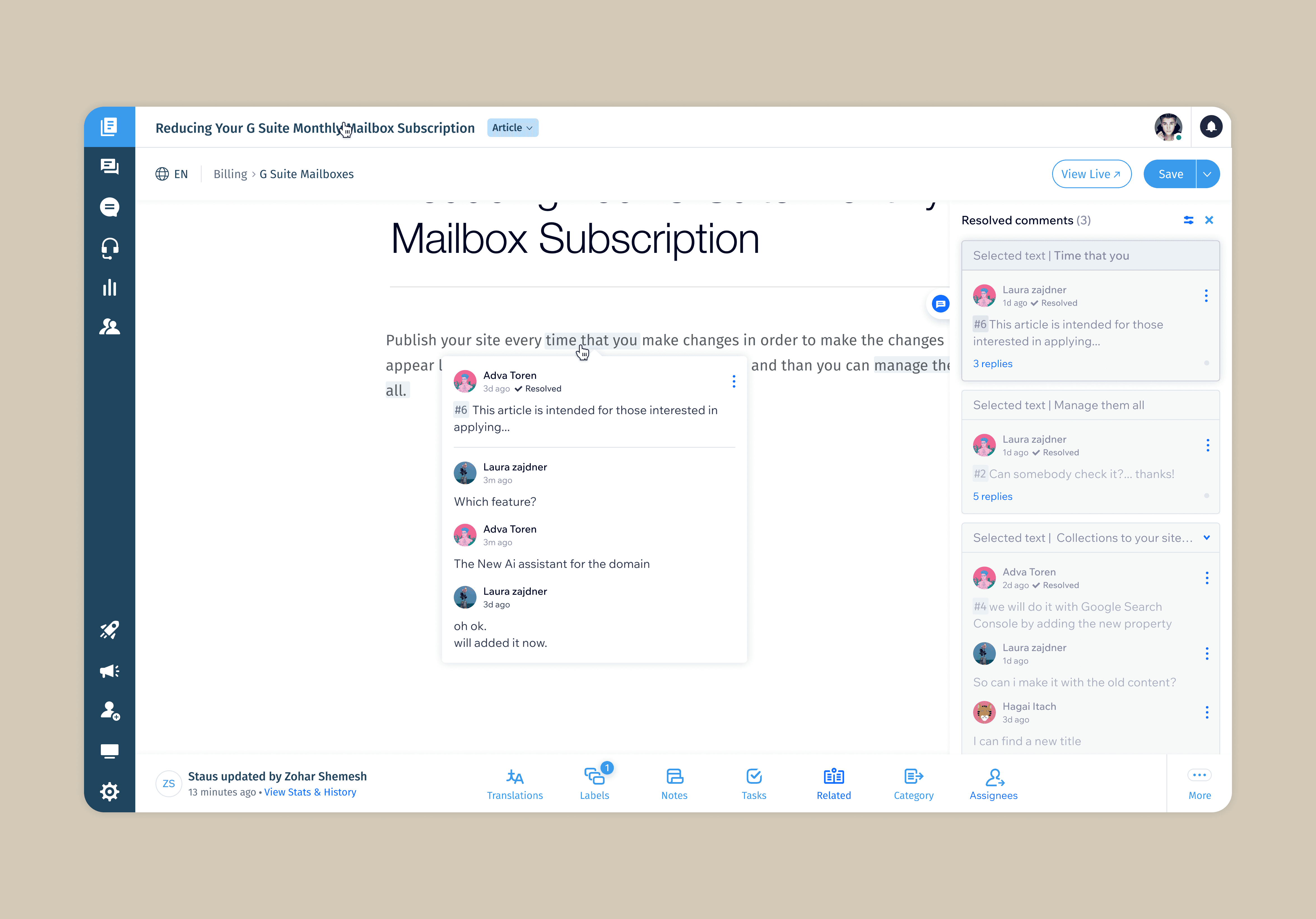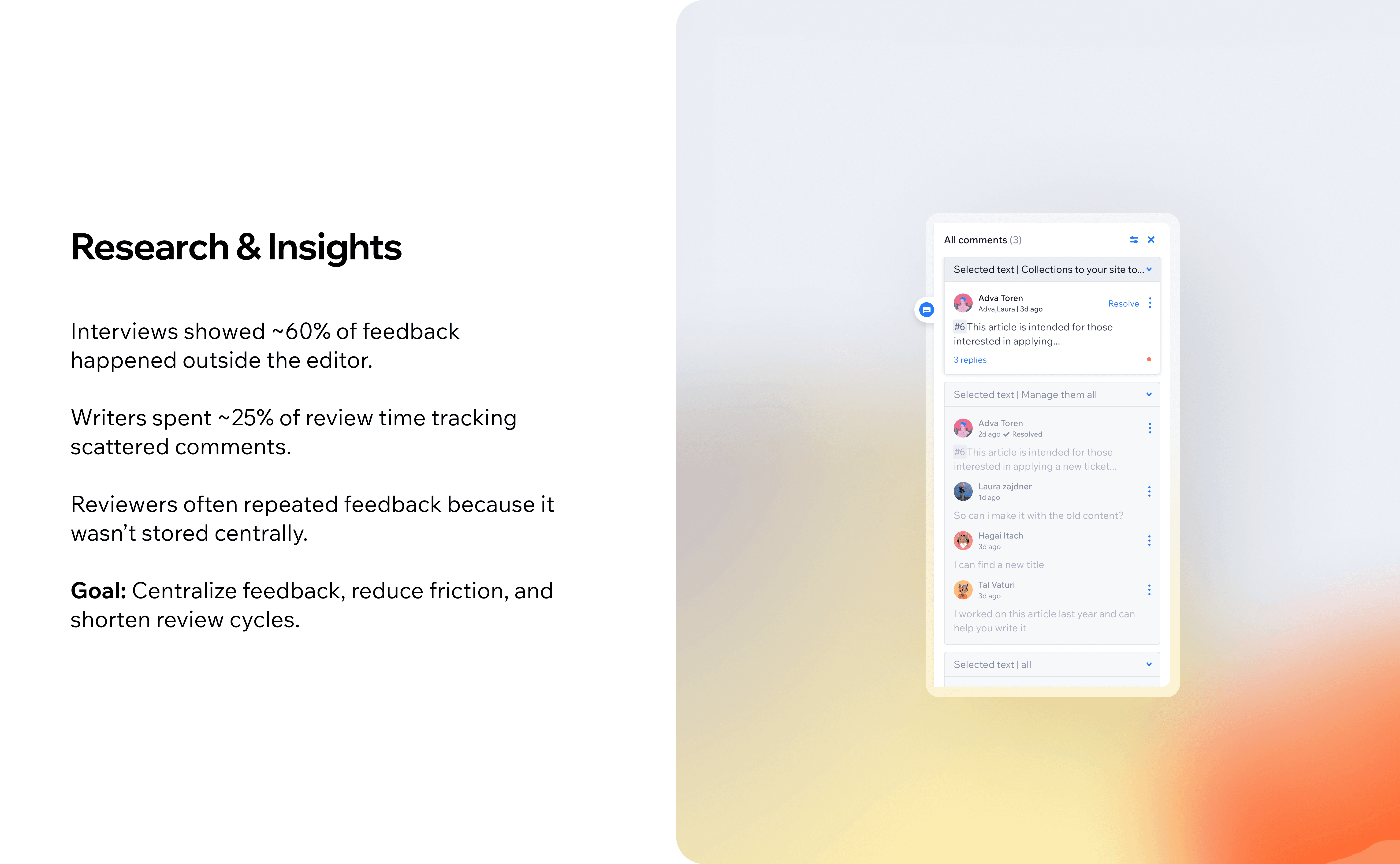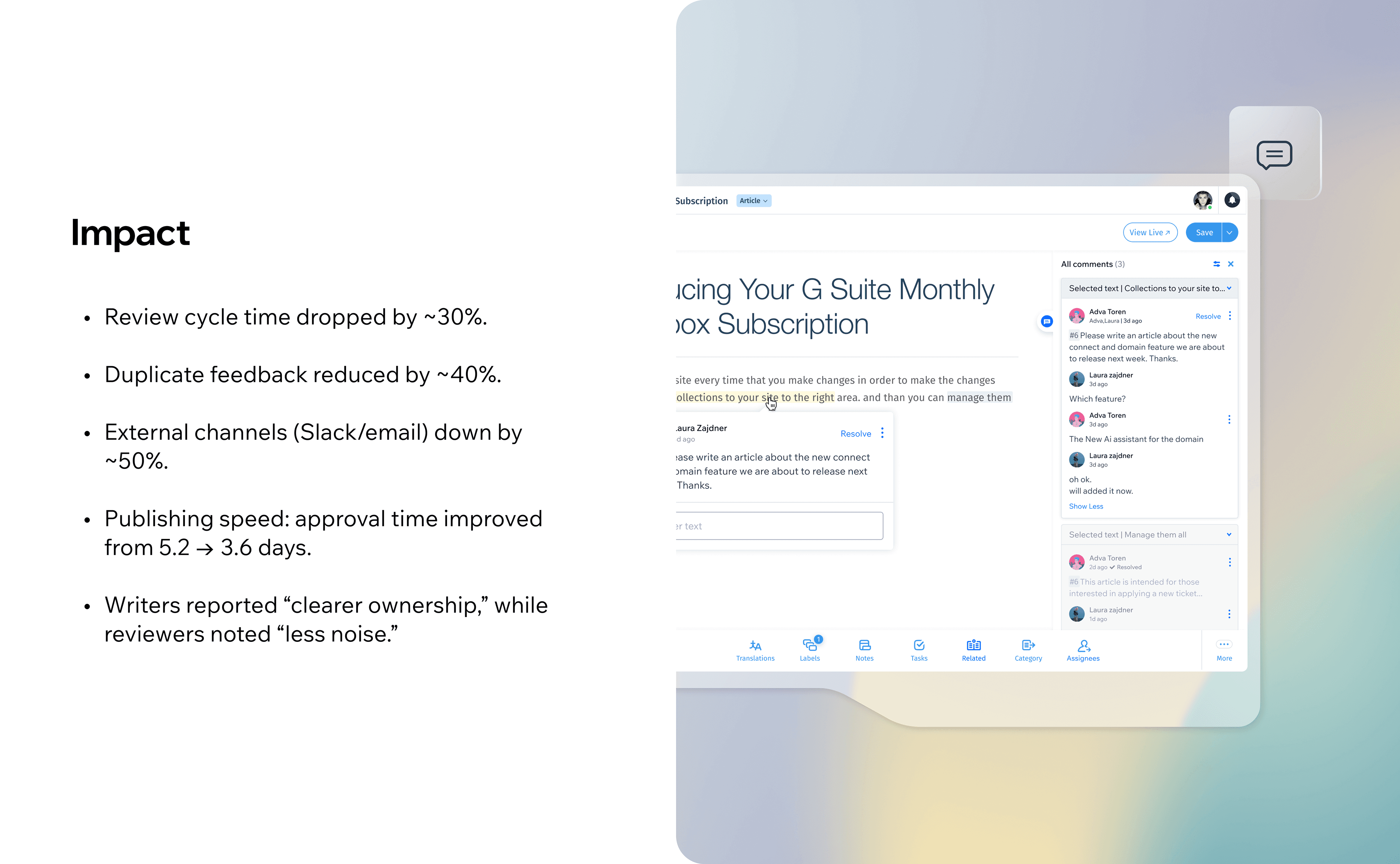 Before this feature, article feedback was scattered across Slack, emails, or spreadsheets — leading to lost discussions, unclear ownership, and slower publishing cycles. Teams needed a way to collaborate inside the editor itself rather than in external tools.