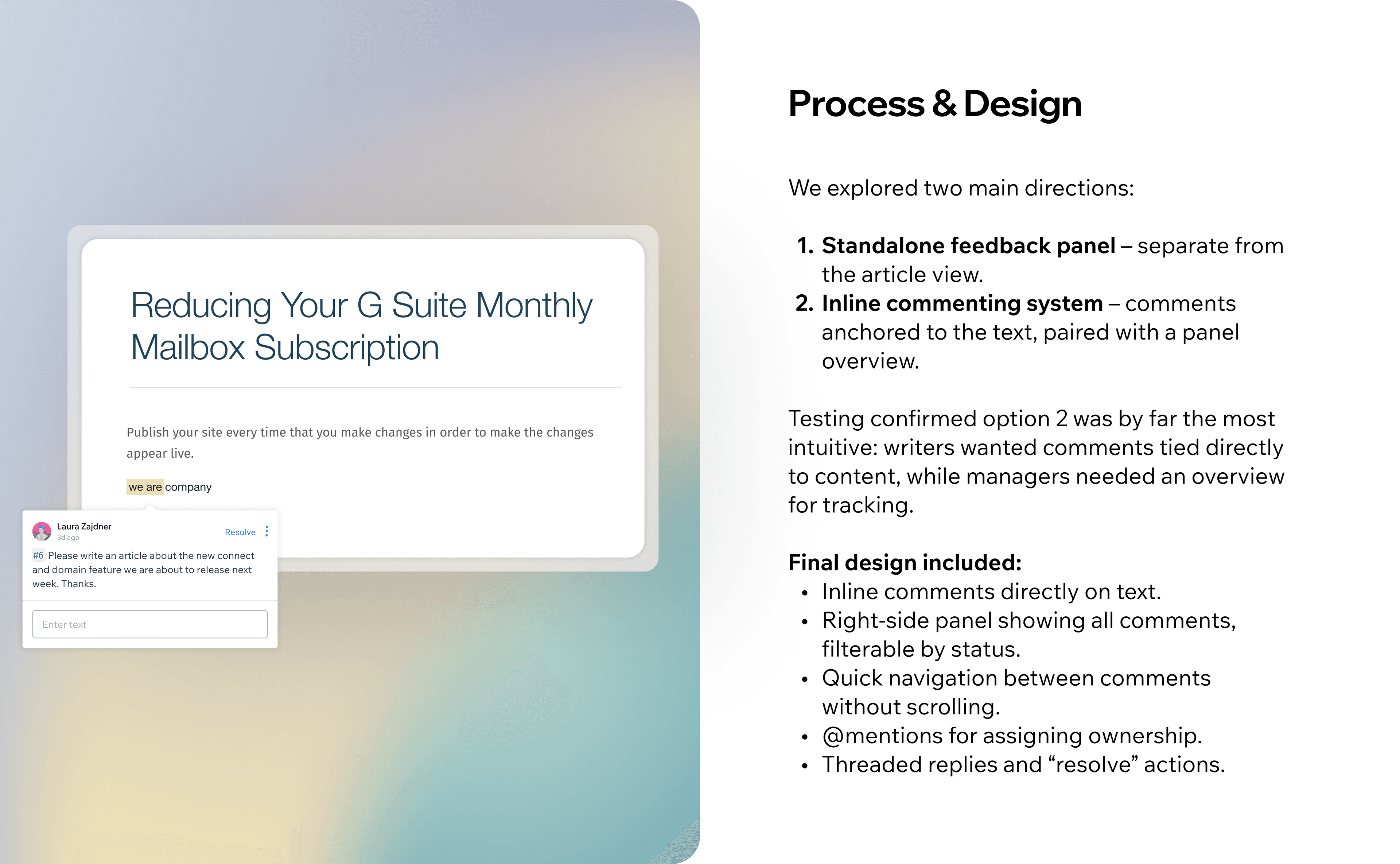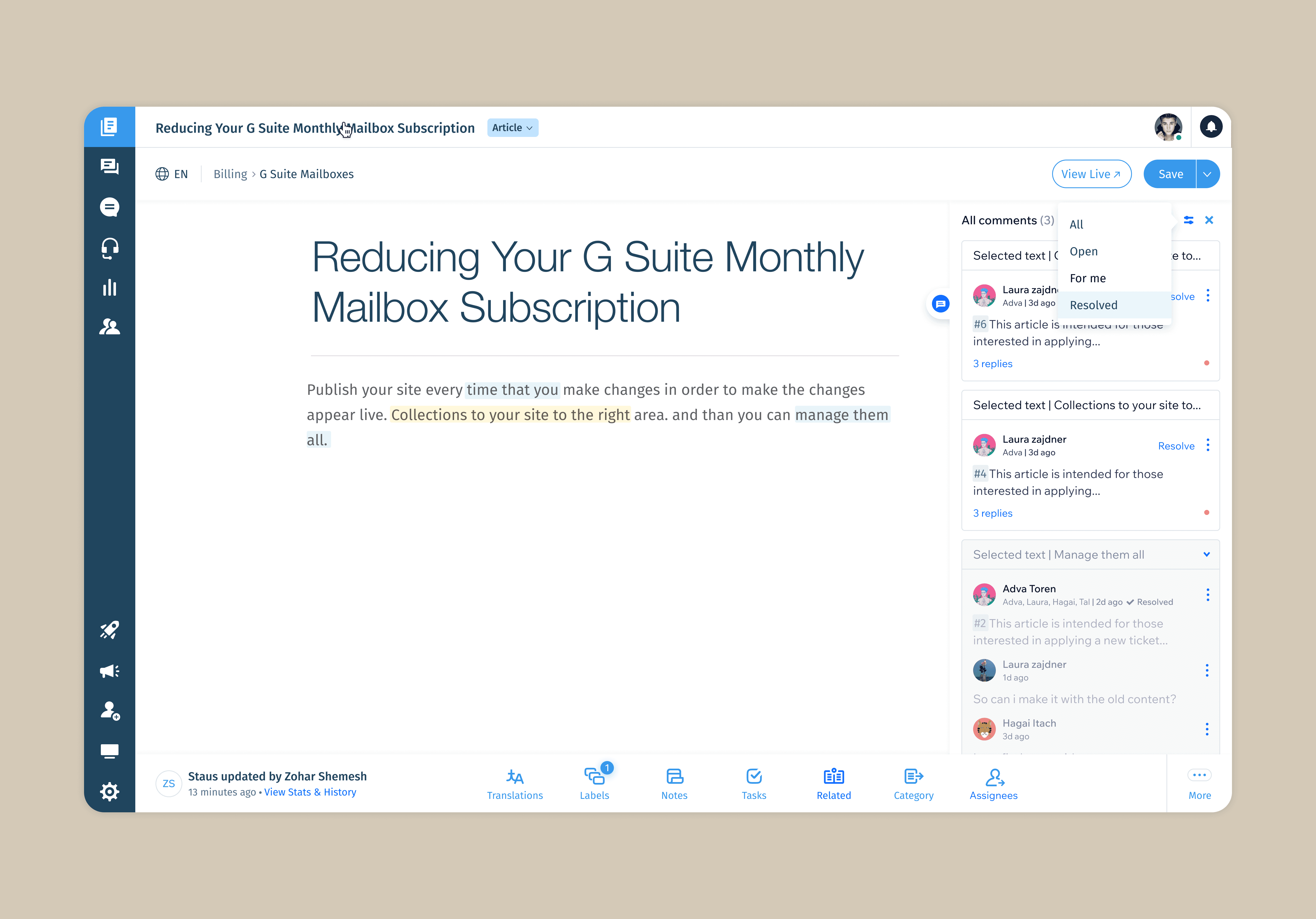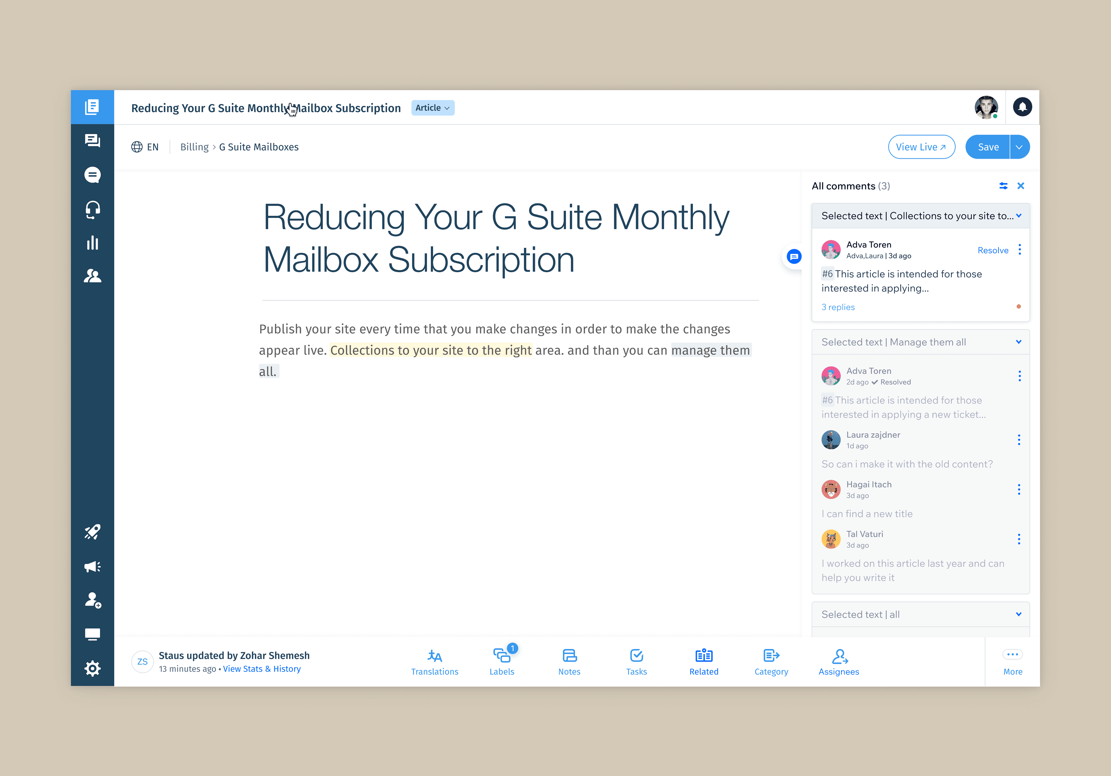 Before this feature, article feedback was scattered across Slack, emails, or spreadsheets — leading to lost discussions, unclear ownership, and slower publishing cycles. Teams needed a way to collaborate inside the editor itself rather than in external tools.