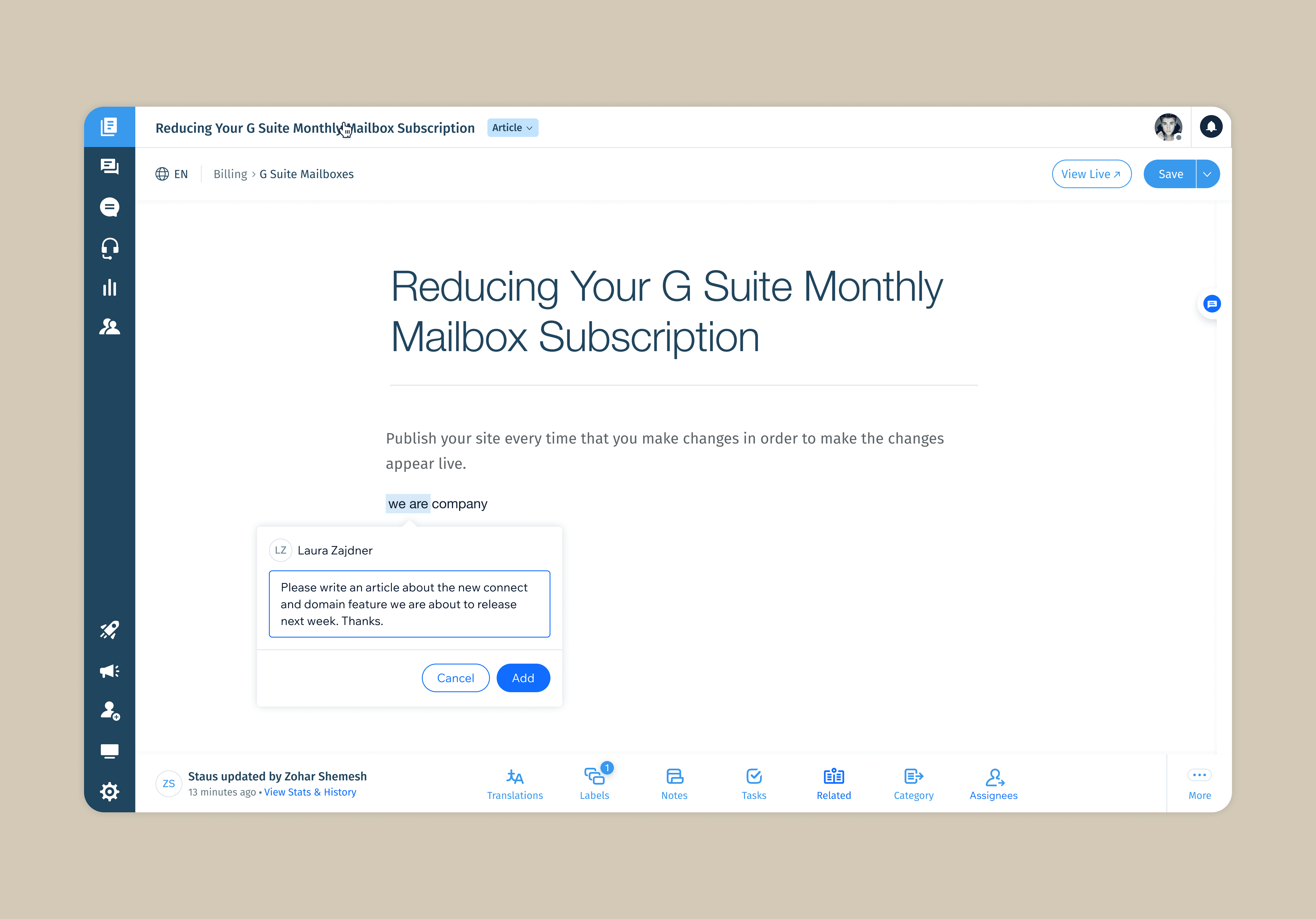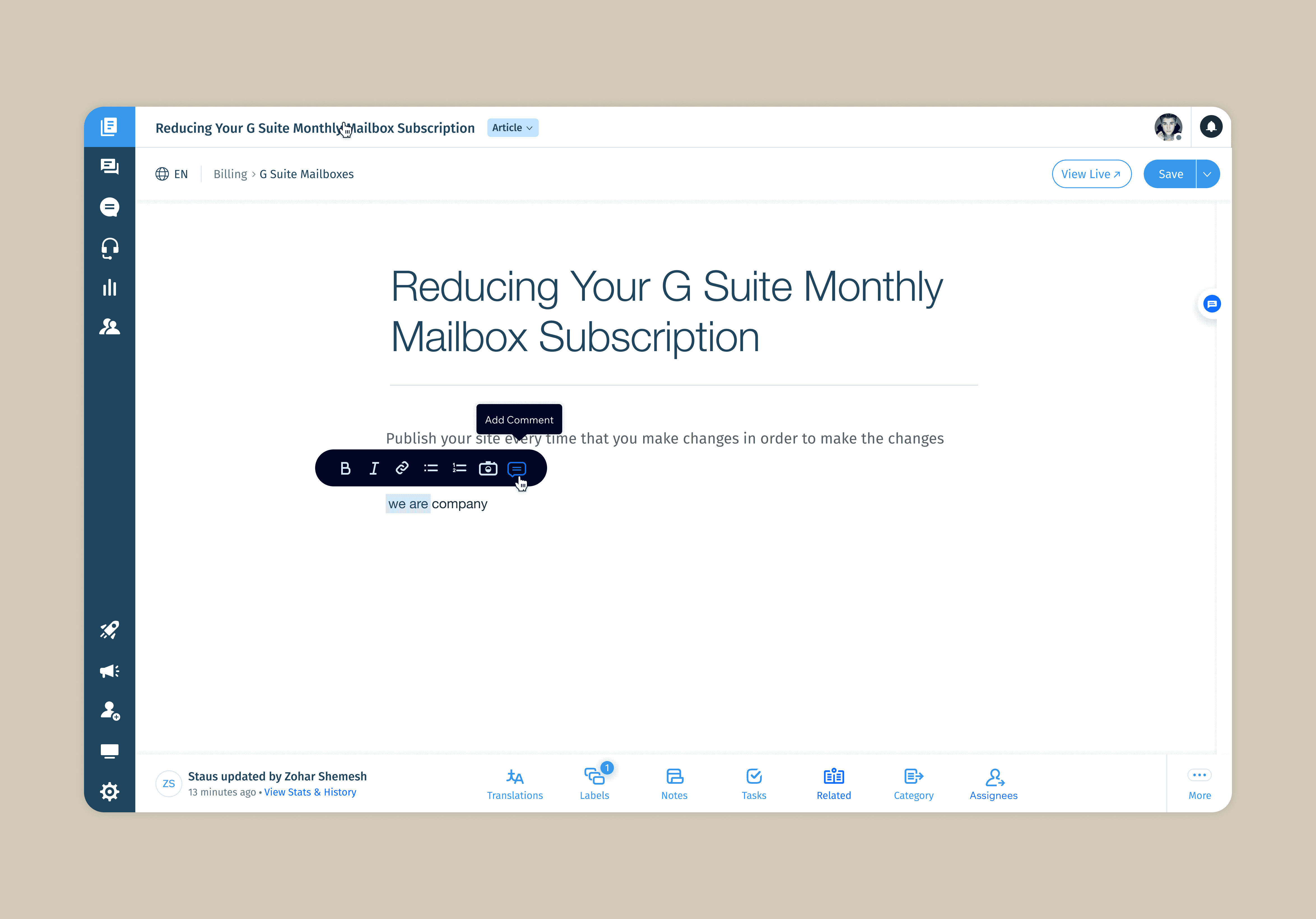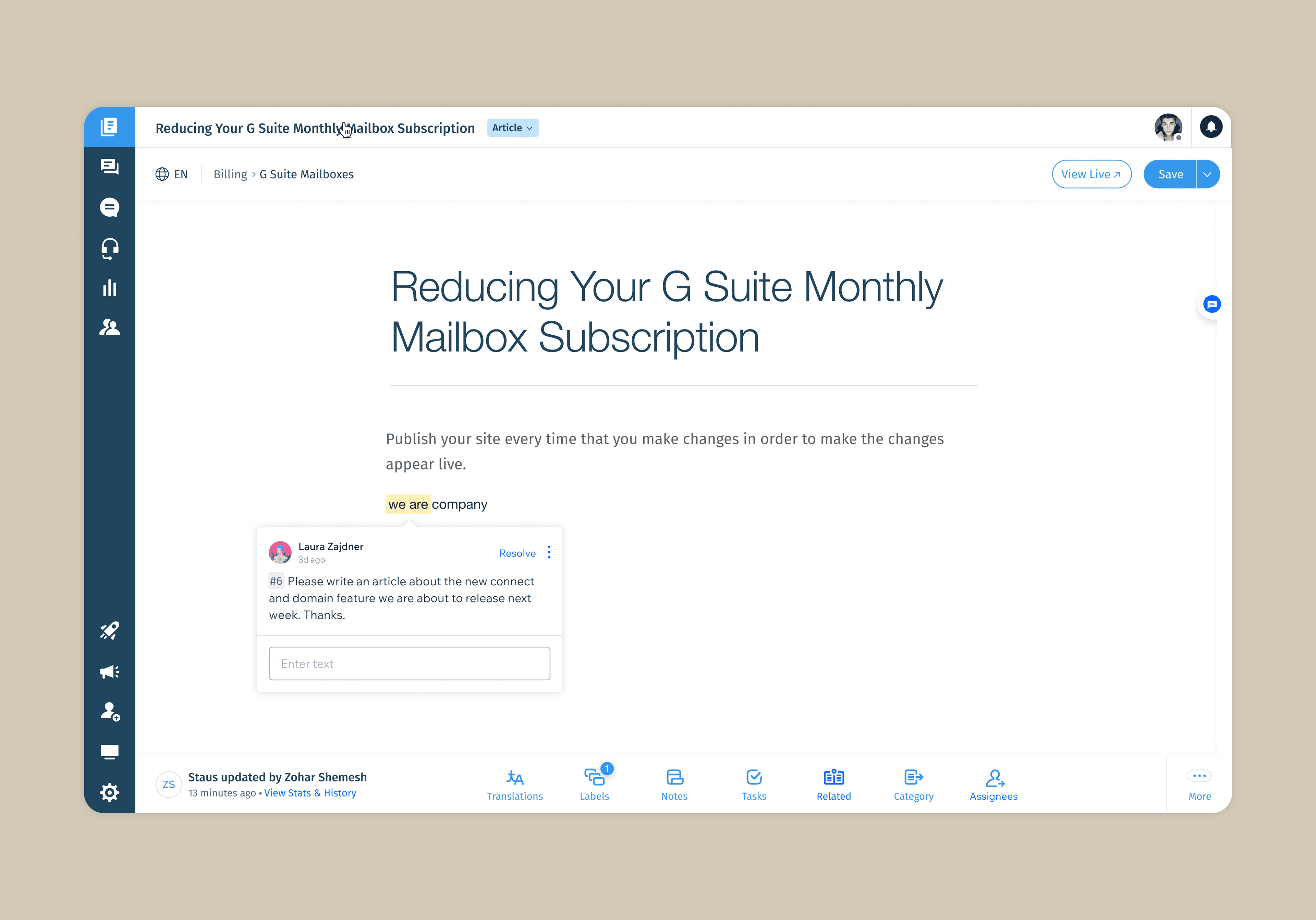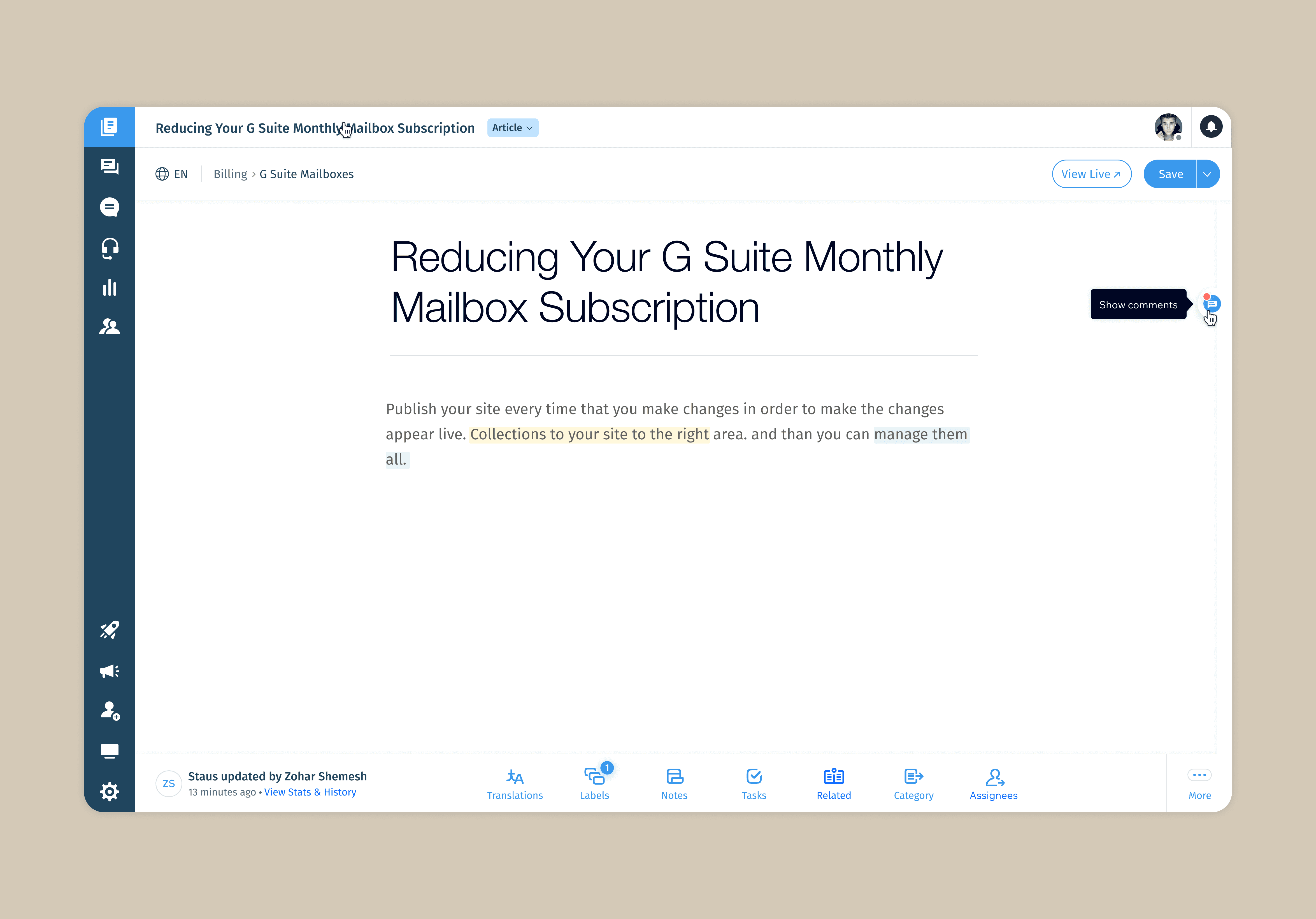 Before this feature, article feedback was scattered across Slack, emails, or spreadsheets — leading to lost discussions, unclear ownership, and slower publishing cycles. Teams needed a way to collaborate inside the editor itself rather than in external tools.