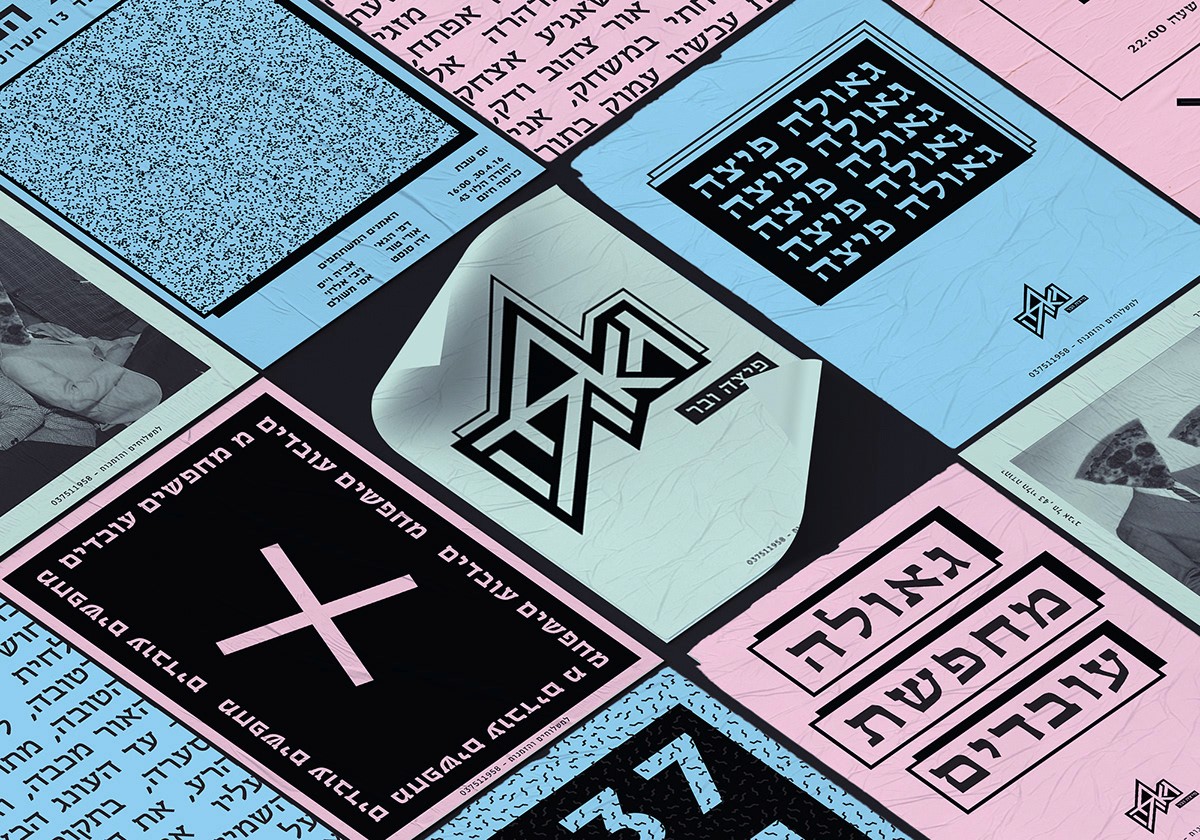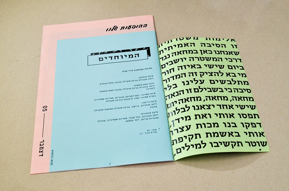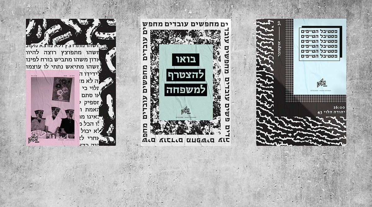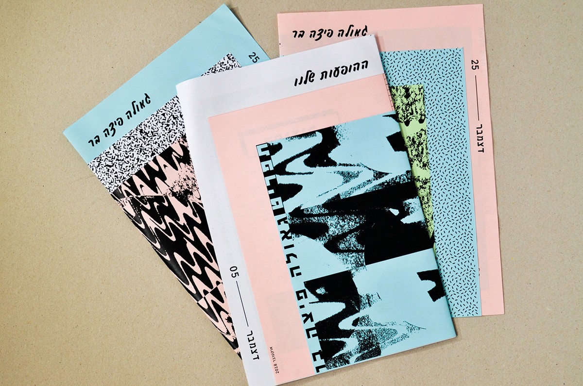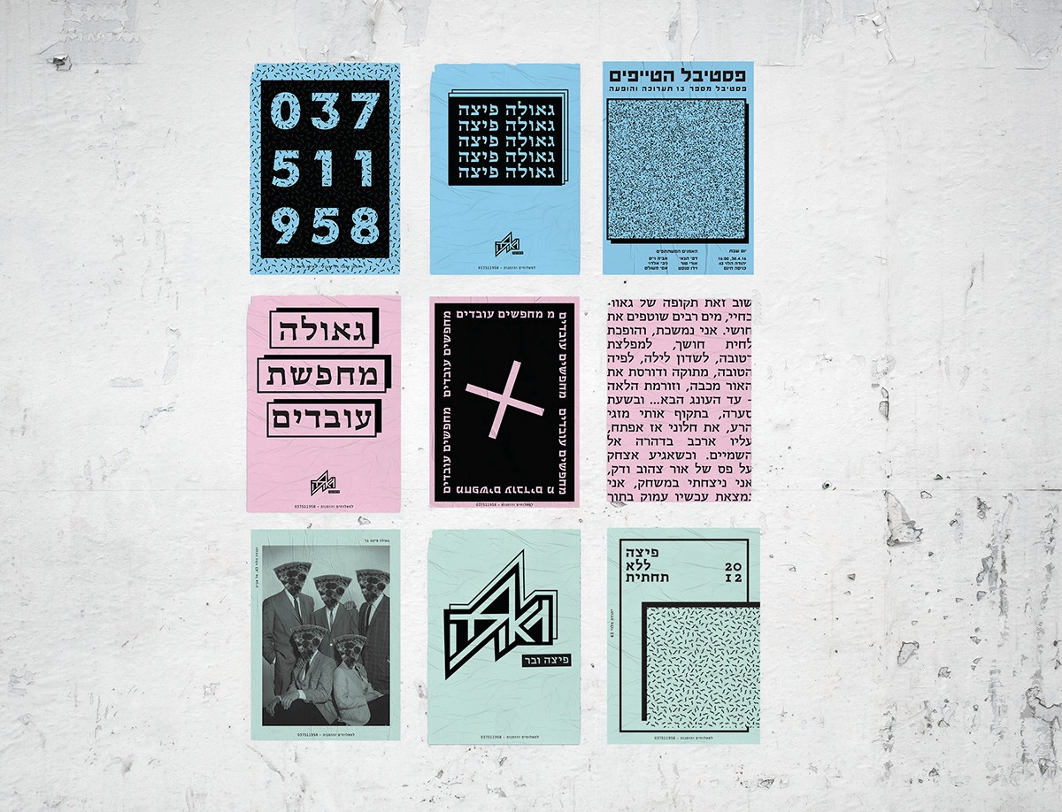 I have spoken from a point that pizza is available, it can be fast food, demands the minimum necessities, personally speaking - I rather eat in an underground pizza place than on some fancy restaurant downtown plus it's always available immediately and cheap and not being ‘’wanna be’’ on you. All these things connected me to the street scene in general and to all of the punk culture in particular. The punk culture is disgusted with materialism, it is very urban. The name Geula (free translate from hebrew to salvation, redemption, freedom), refers to the ideology of the punk culture, to the freedom of peace and redemption they believed in the suppression of the law and the establishment or anything that reminded Western society. The place itself is a pizza bar that provides a stage for music, the place is just delicious and cheap. Everyone who buys a pizza gets a poster, each time a different random poster. Few words on the design language, at first i focused on fanzines whose goal was quick and cheap. I chose a three main colors palette of simple, inexpensive pages.