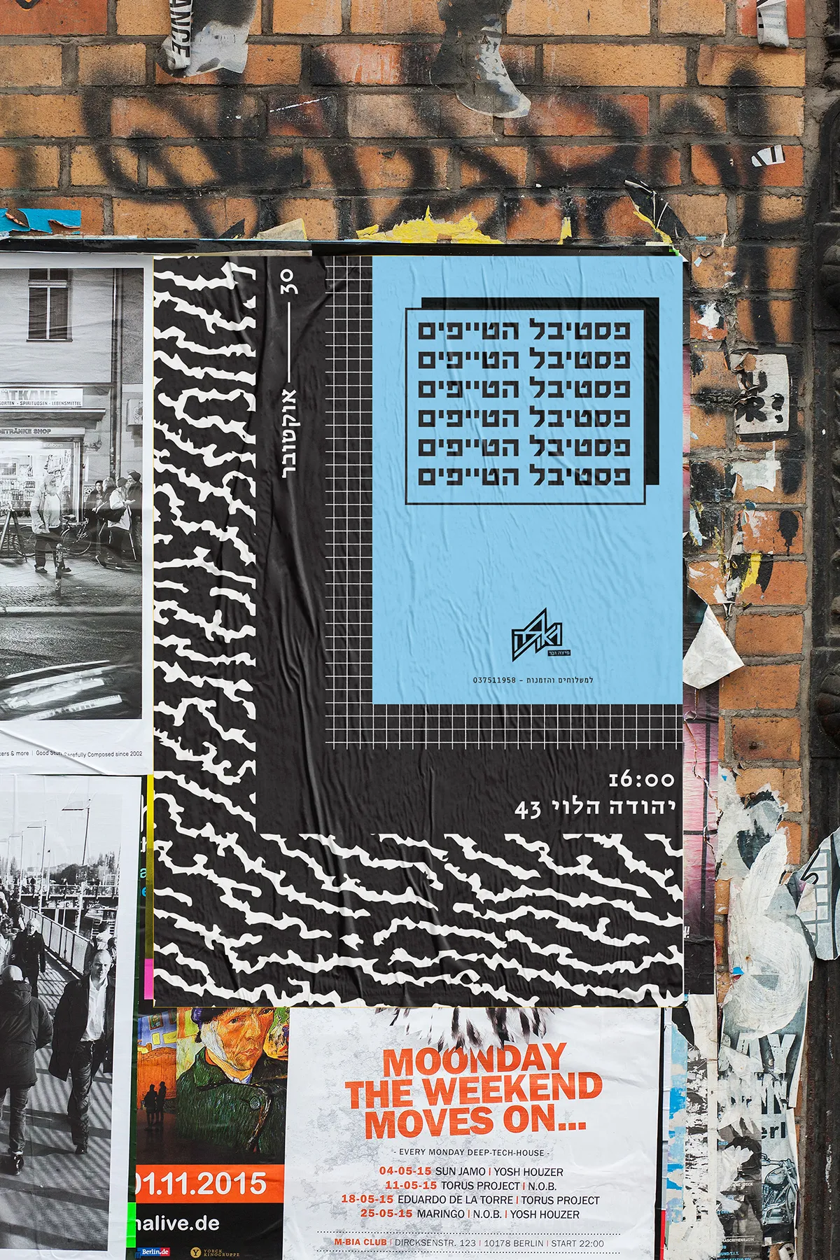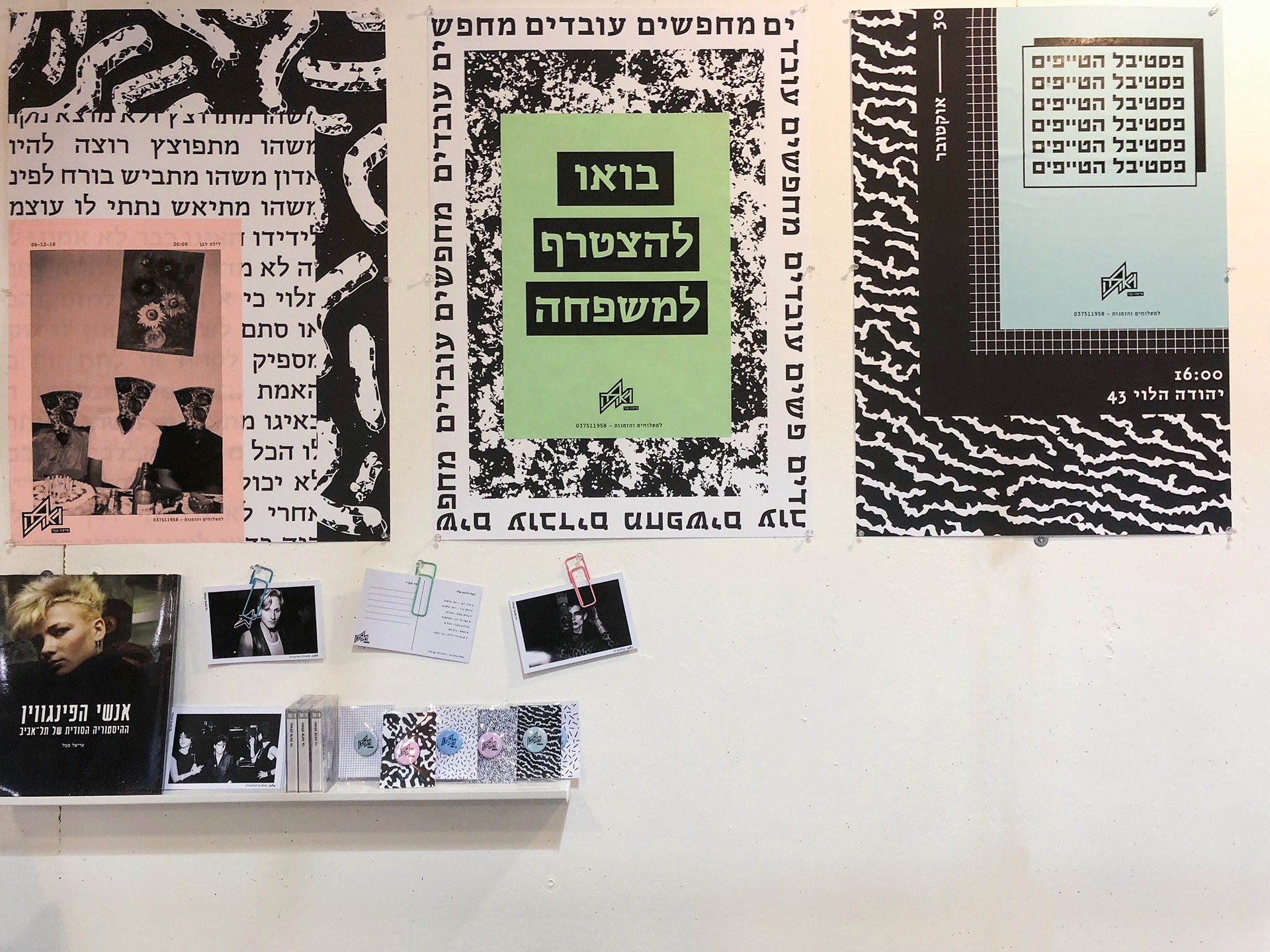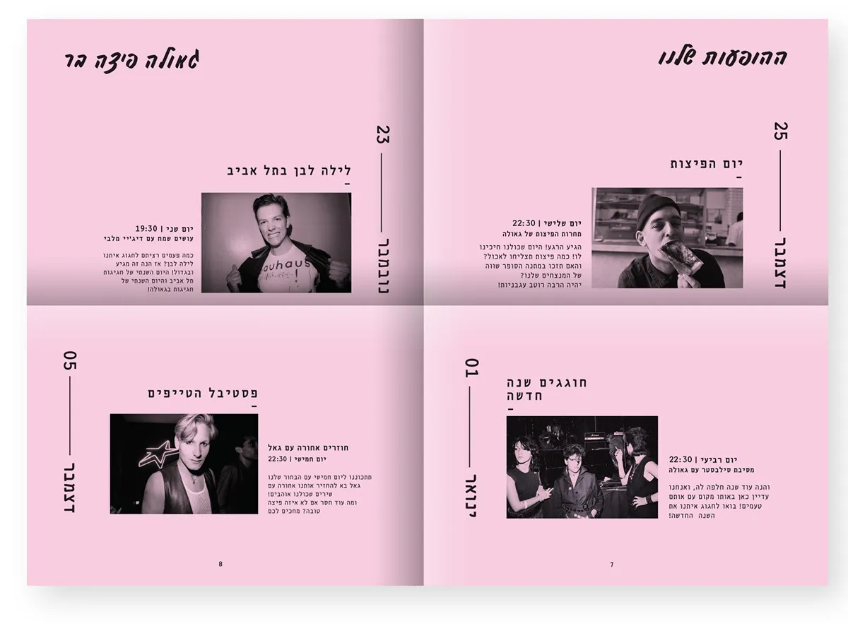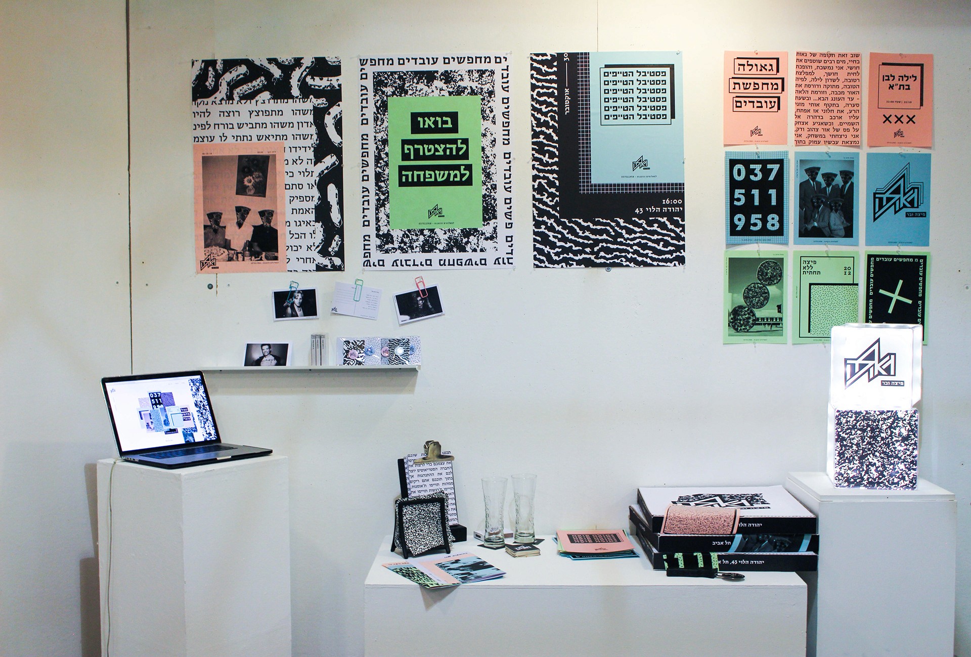 I have spoken from a point that pizza is available, it can be fast food, demands the minimum necessities, personally speaking - I rather eat in an underground pizza place than on some fancy restaurant downtown plus it's always available immediately and cheap and not being ‘’wanna be’’ on you. All these things connected me to the street scene in general and to all of the punk culture in particular. The punk culture is disgusted with materialism, it is very urban. The name Geula (free translate from hebrew to salvation, redemption, freedom), refers to the ideology of the punk culture, to the freedom of peace and redemption they believed in the suppression of the law and the establishment or anything that reminded Western society. The place itself is a pizza bar that provides a stage for music, the place is just delicious and cheap. Everyone who buys a pizza gets a poster, each time a different random poster. Few words on the design language, at first i focused on fanzines whose goal was quick and cheap. I chose a three main colors palette of simple, inexpensive pages.
