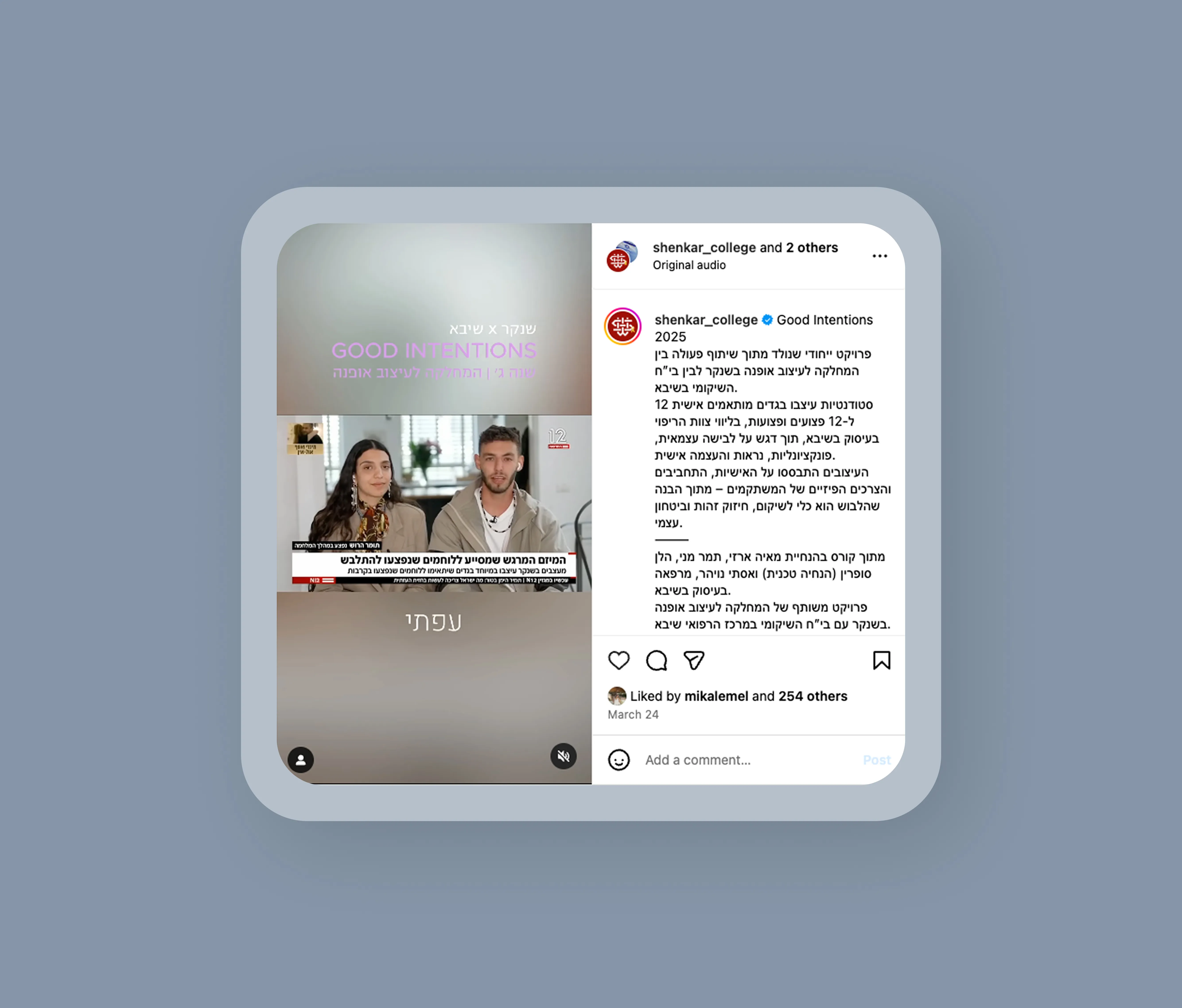 A collaborative project between Shenkar’s Fashion Design Department and the Sheba Medical Center’s Rehabilitation Department for war-injured soldiers.