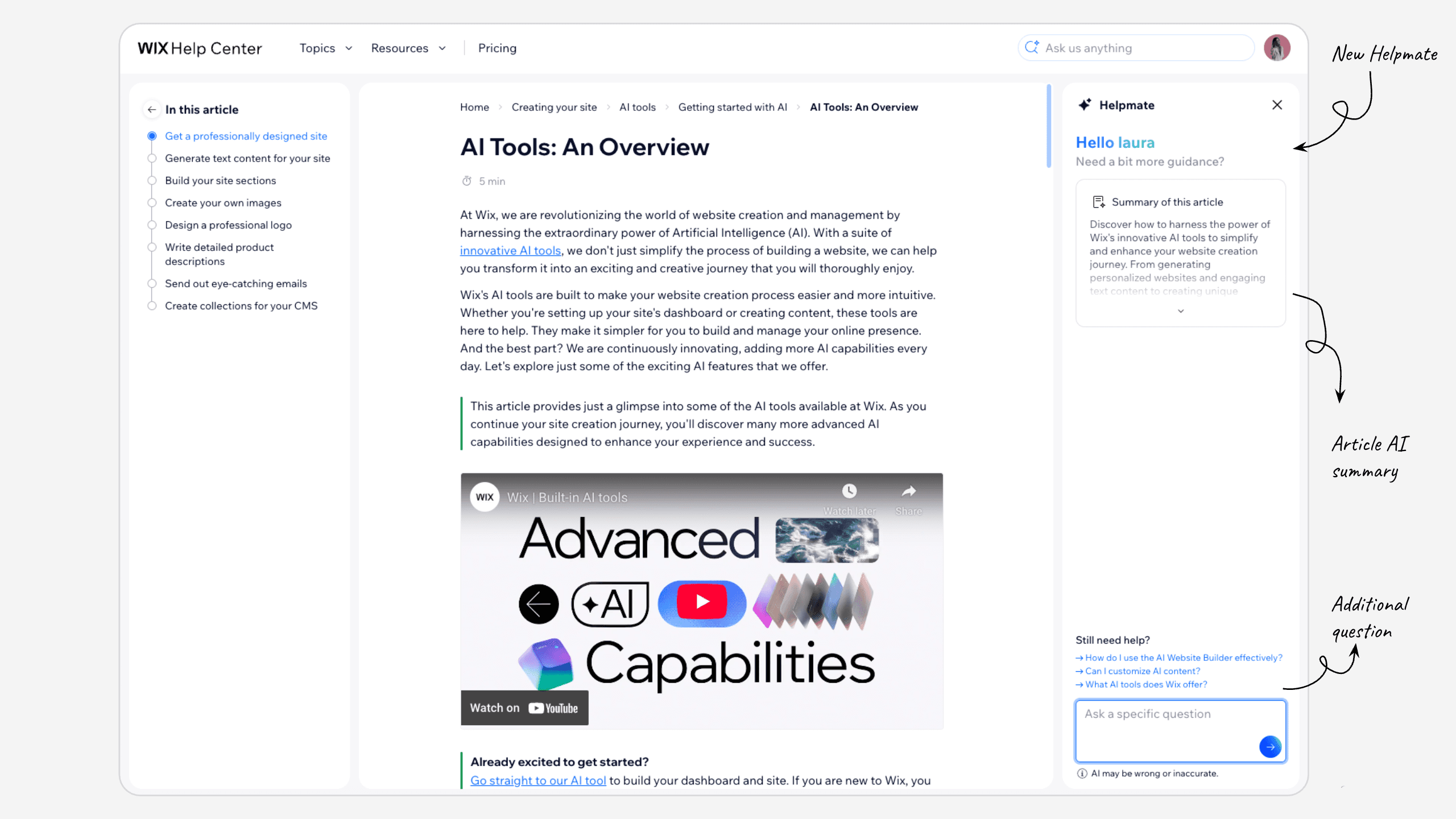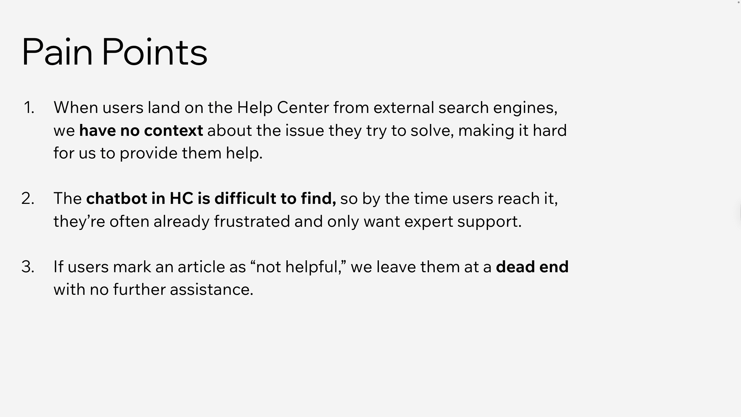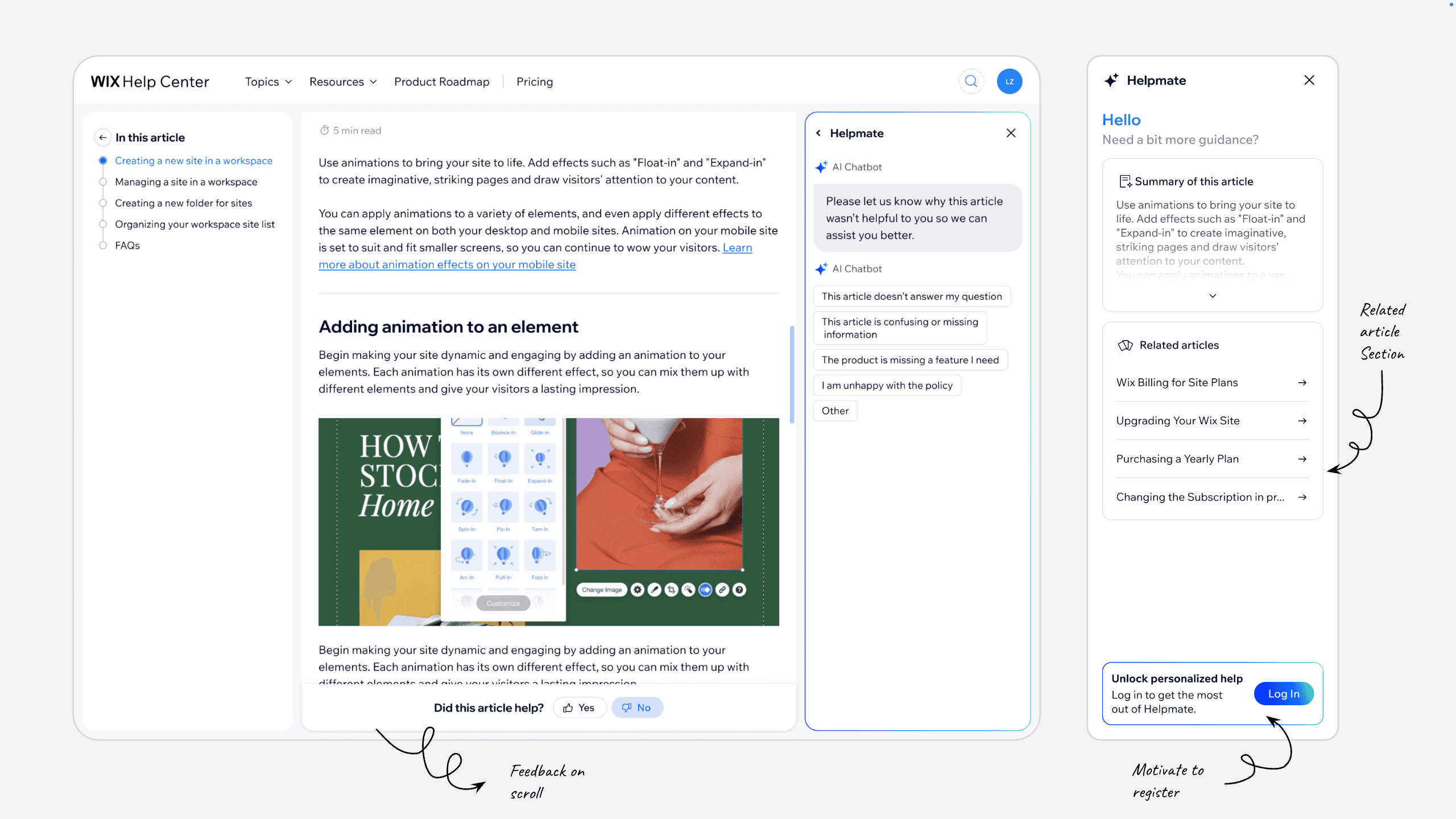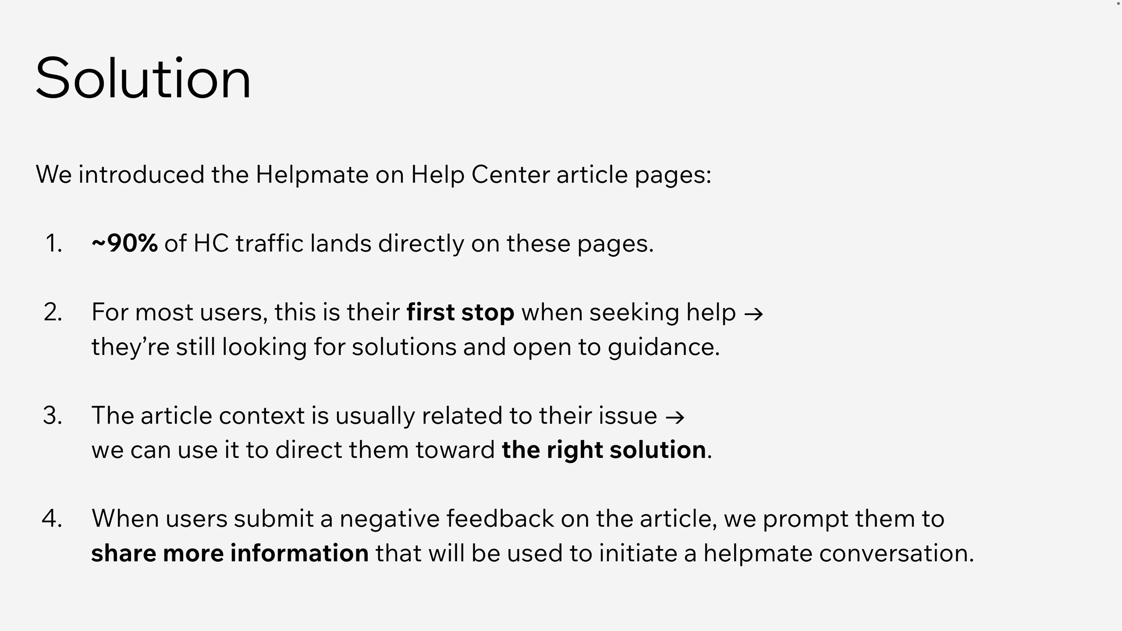 In Wix's Help Center, I designed Helpmate - a contextual side-chat that enhances the self-service experience. Helpmate provides a smart summary of each article, suggests follow-up questions with direct links, and opens a conversational flow when users need more guidance. This hybrid interface bridges static reading with dynamic interaction, reducing friction, saving time, and giving users the sense of being supported rather than left alone with dense content. By combining clarity, accessibility, and engagement, Helpmate both improves user satisfaction and decreases support load.