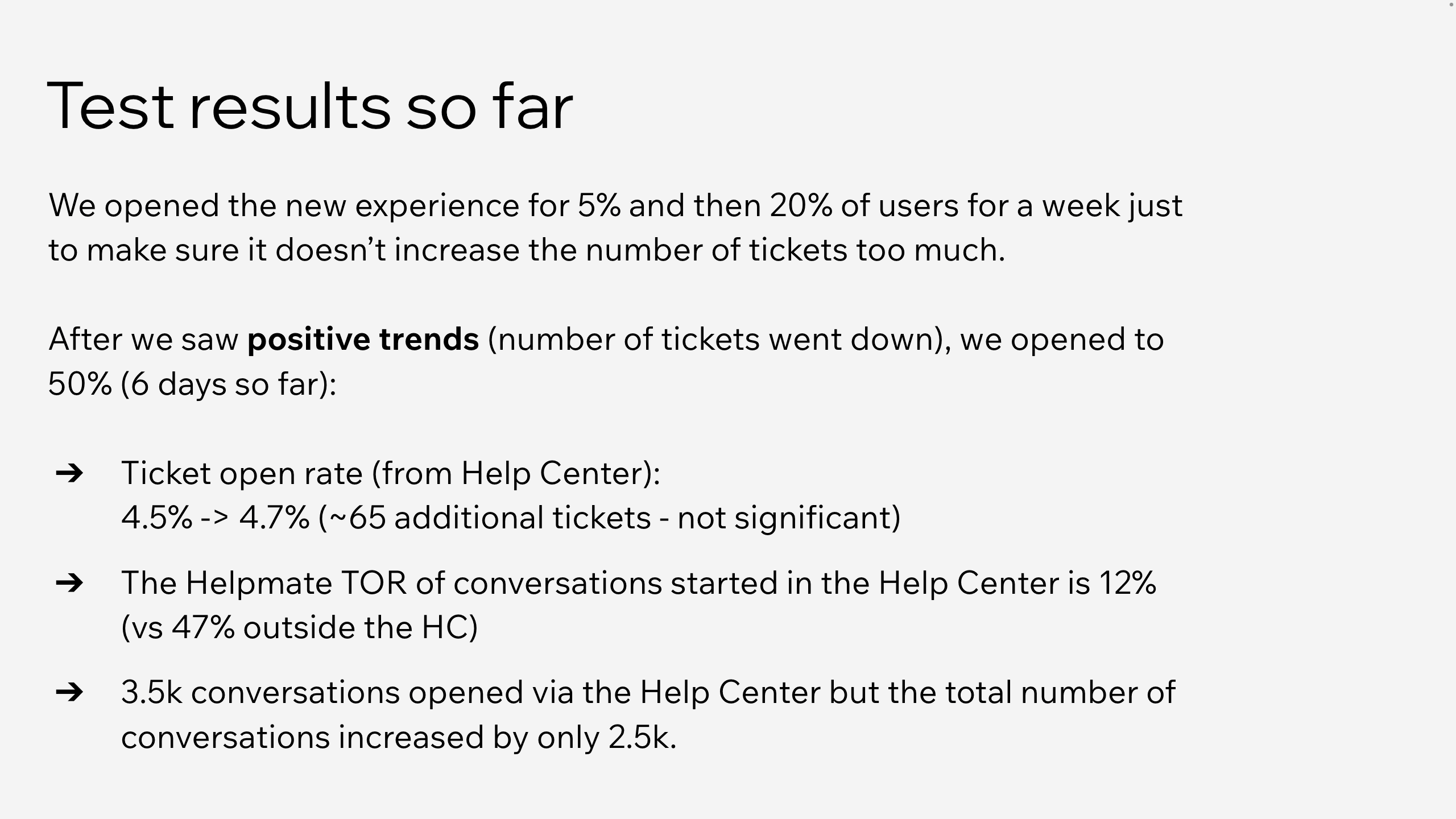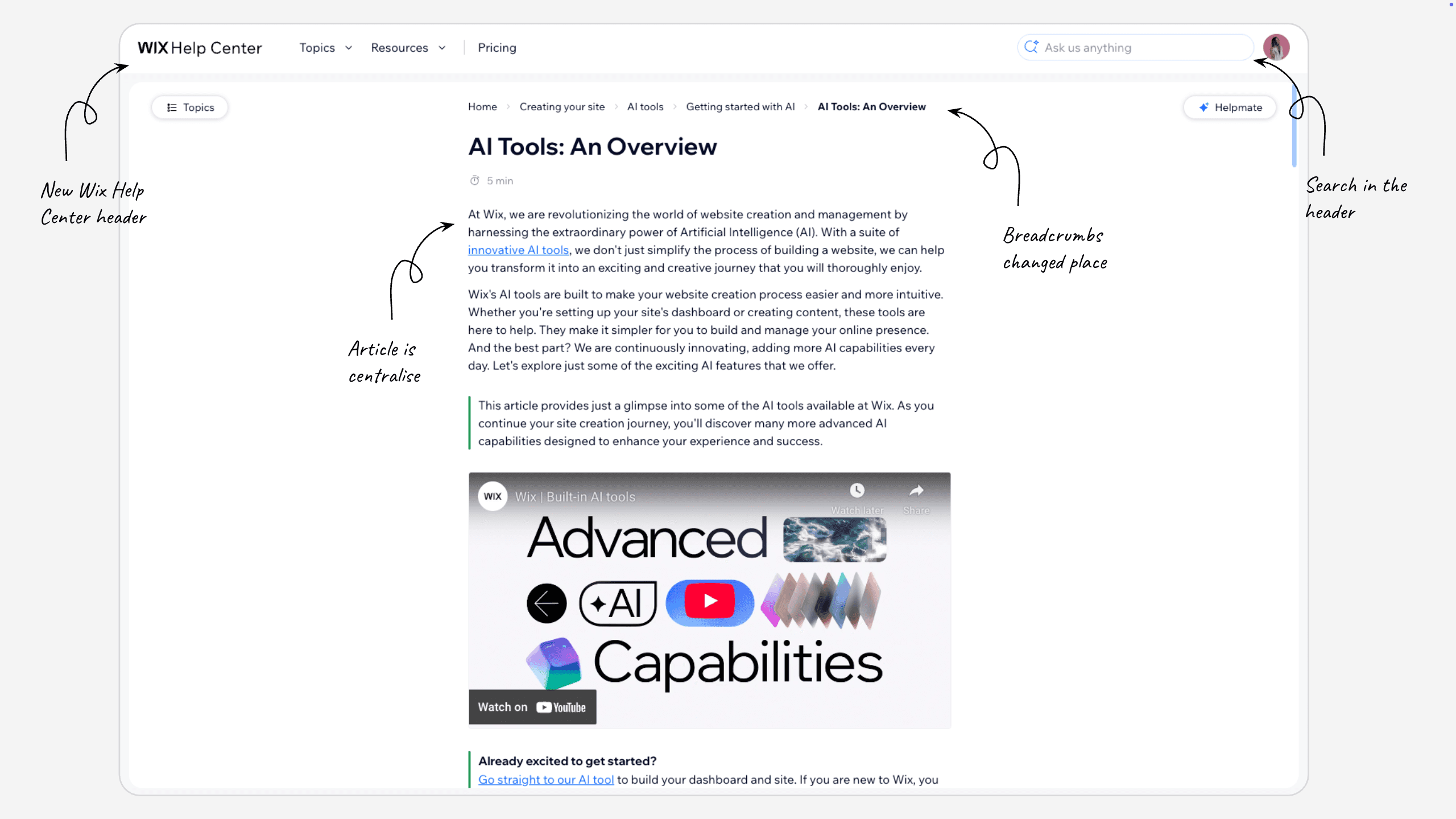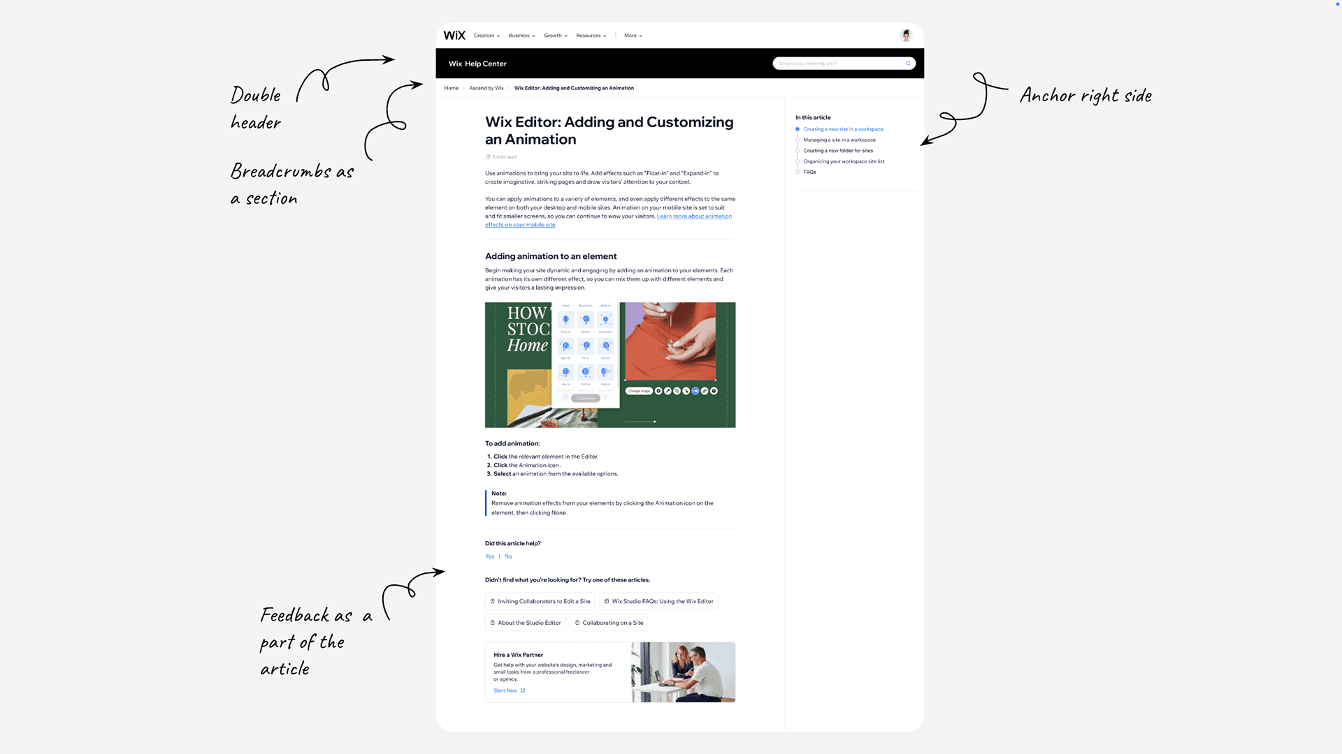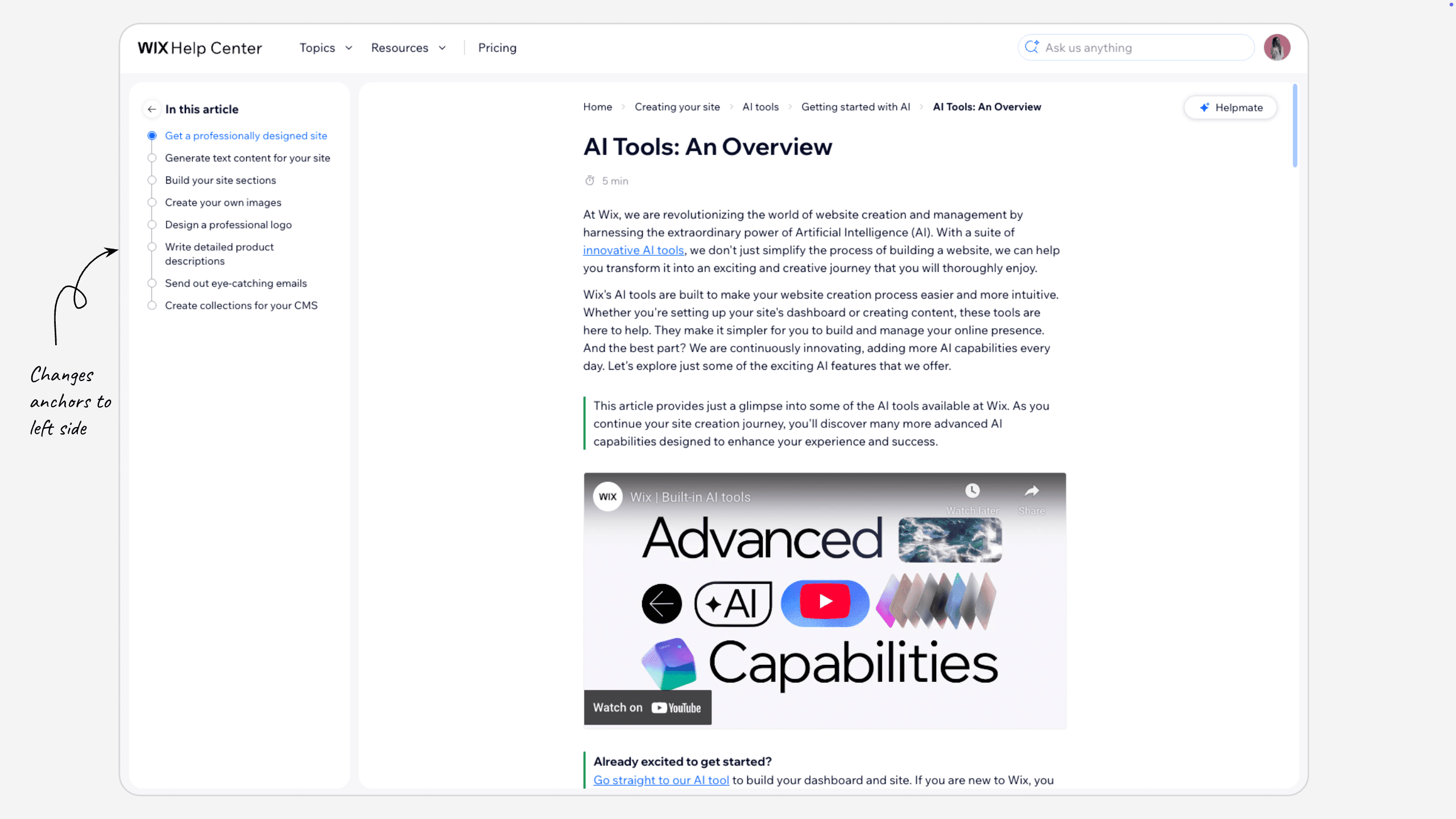 In Wix's Help Center, I designed Helpmate - a contextual side-chat that enhances the self-service experience. Helpmate provides a smart summary of each article, suggests follow-up questions with direct links, and opens a conversational flow when users need more guidance. This hybrid interface bridges static reading with dynamic interaction, reducing friction, saving time, and giving users the sense of being supported rather than left alone with dense content. By combining clarity, accessibility, and engagement, Helpmate both improves user satisfaction and decreases support load.