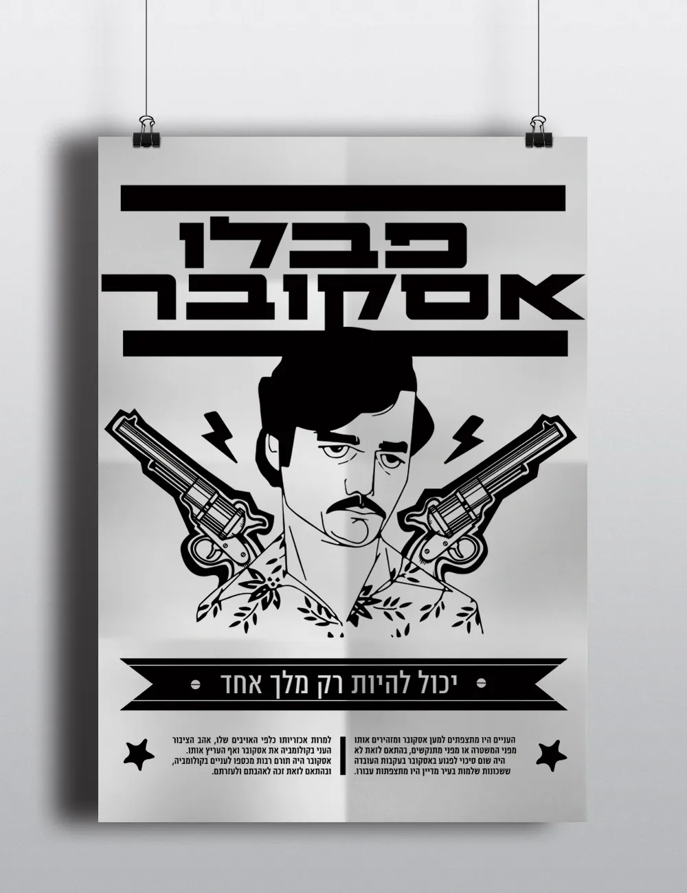 The design plays with the colors of black and white, In all aspects and represents both sides of Escobar. On one hand, the evil personality, and on the other hand the one who supports the poor people.