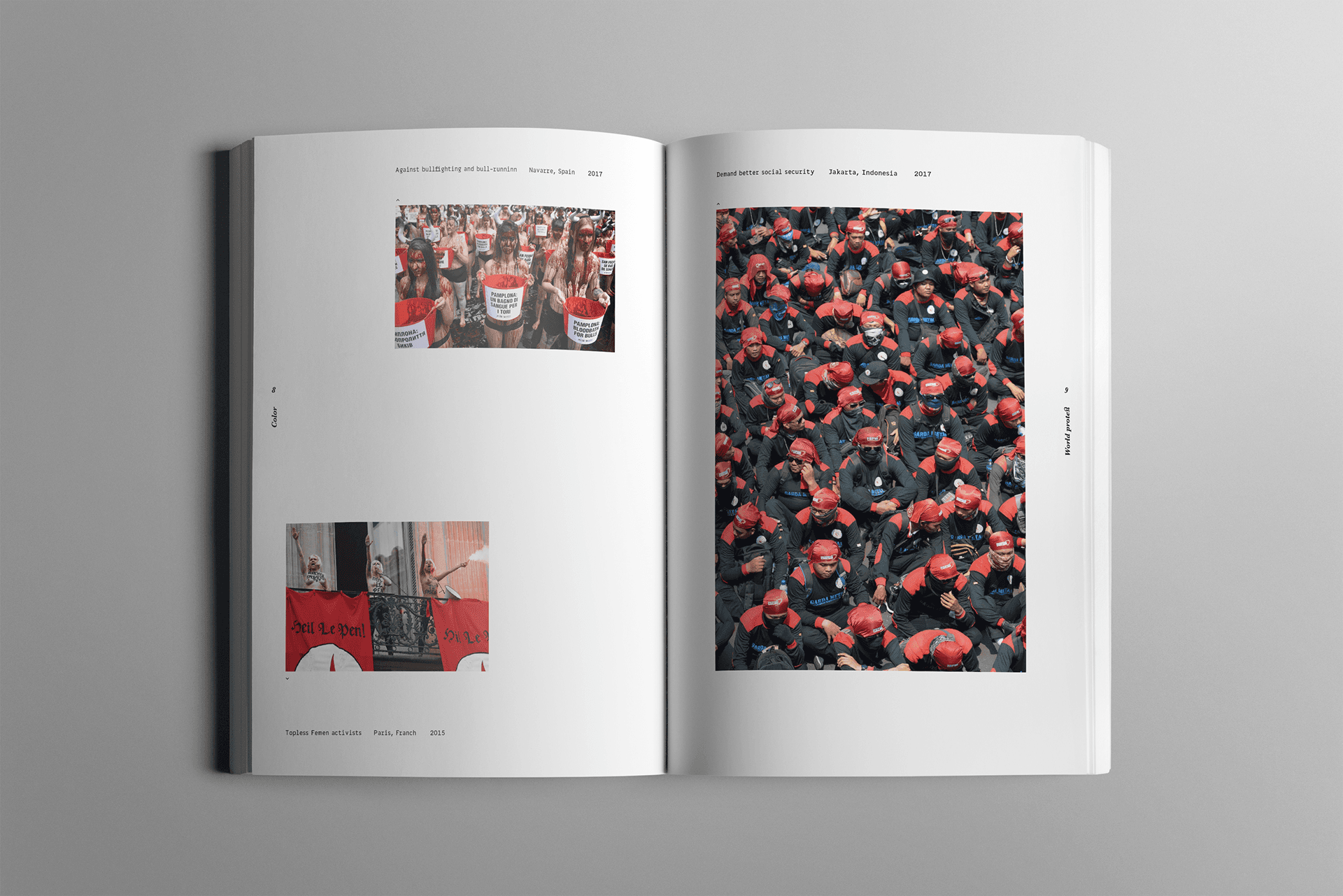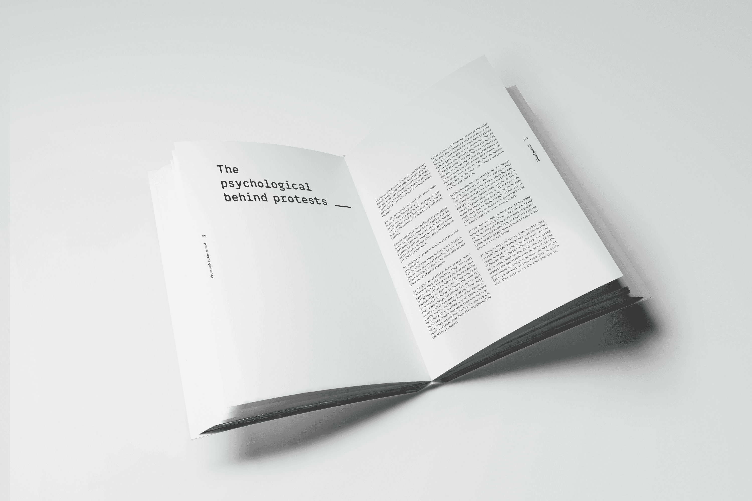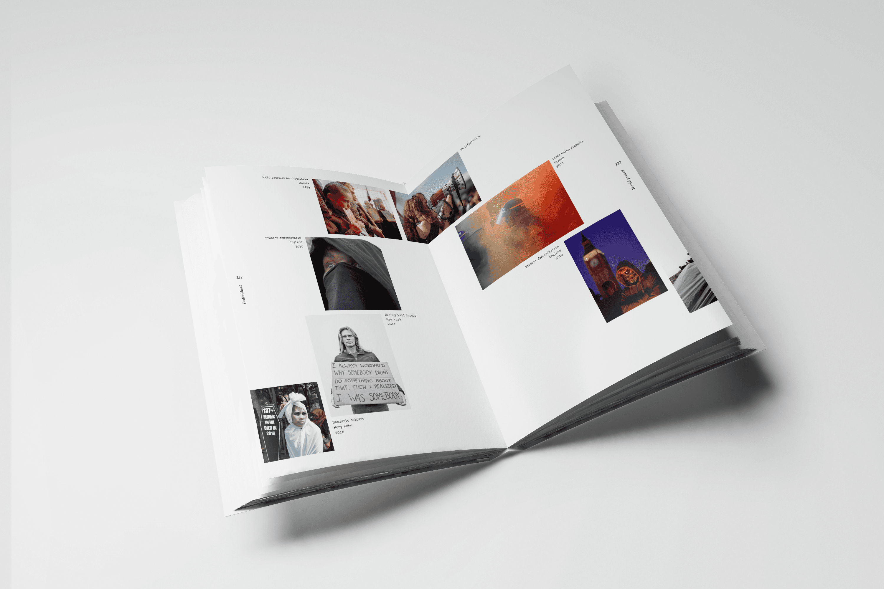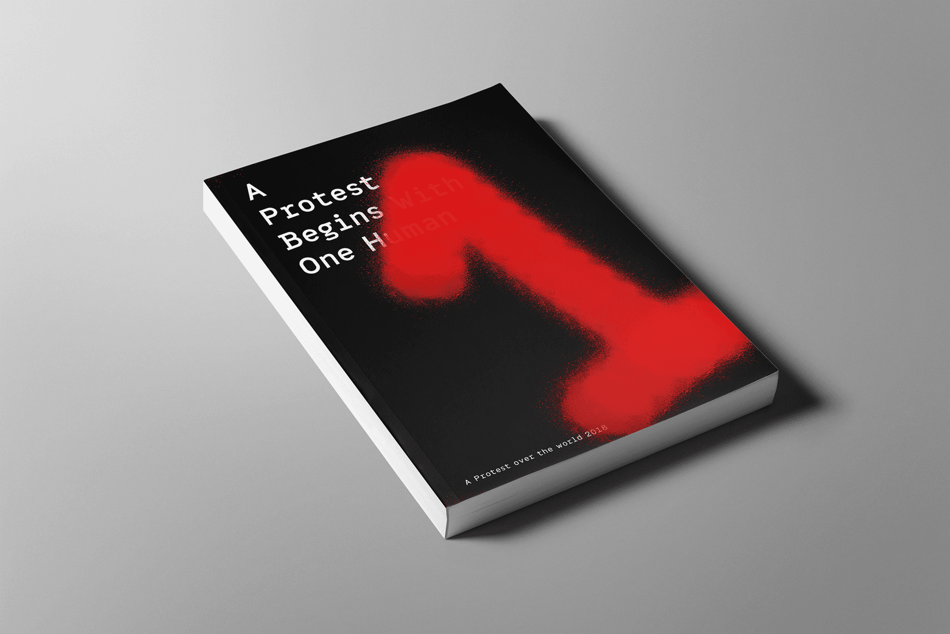 This is a catalog dealing with protests. The catalog is an introduction to the term "protest". The many different shades and layers this term contains. The catalog engages in a trial to see the many shades and layers of the word from the visual point of view. The colors that are bound together on the different billboards exposed in protests. The end focuses on the contrast between the individual as to the masses in a composition.