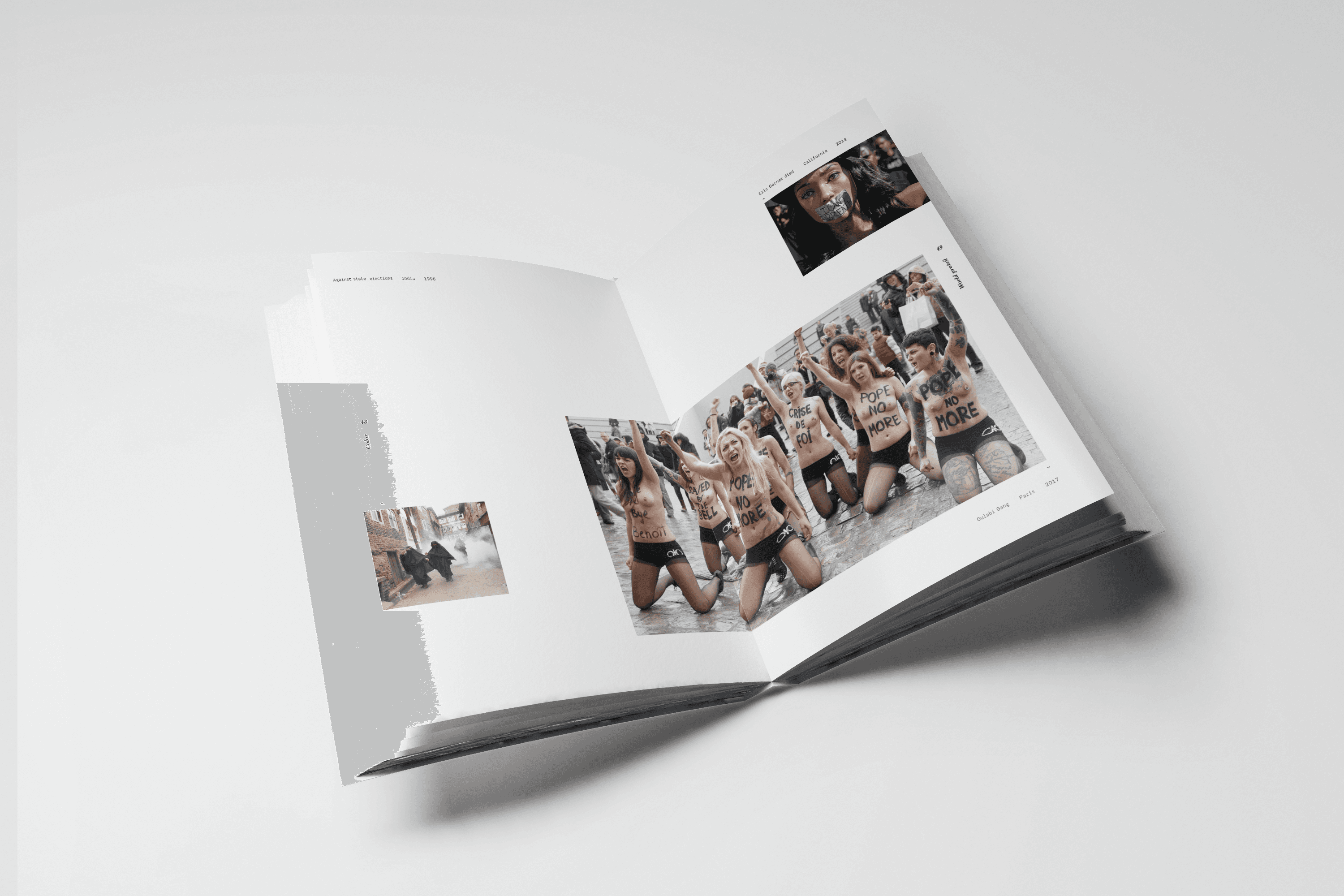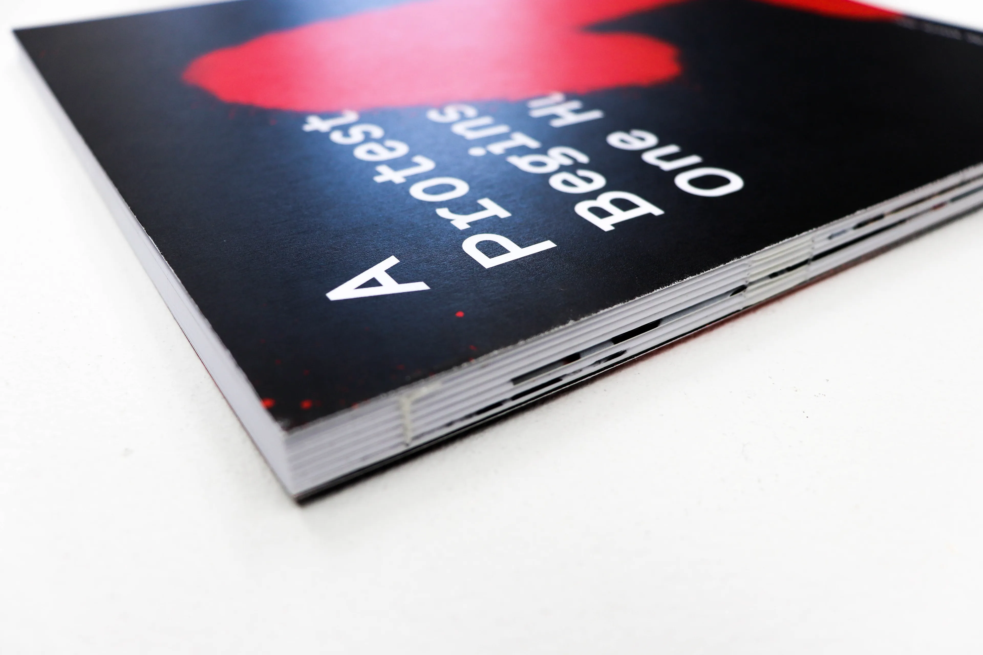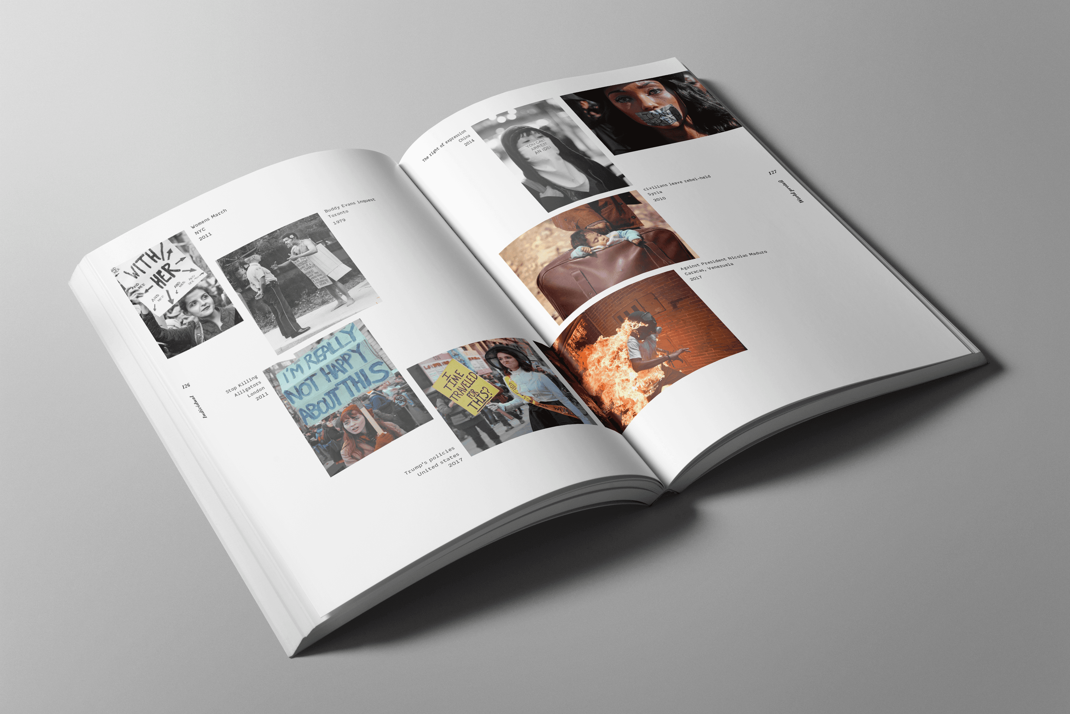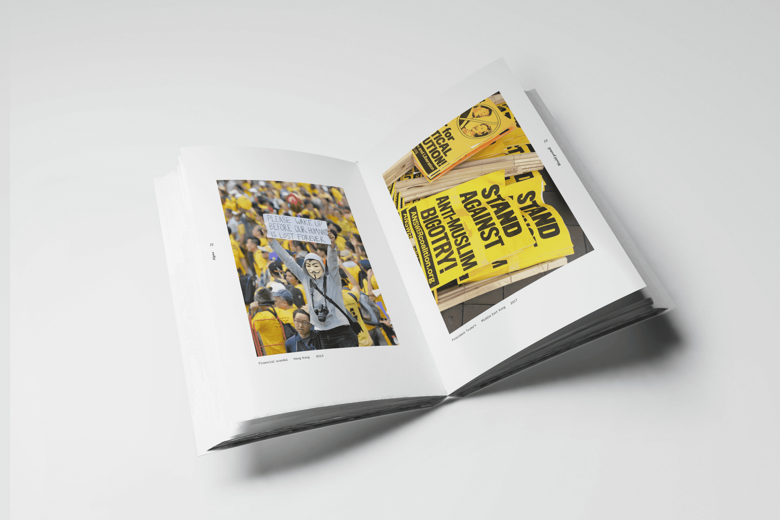 This is a catalog dealing with protests. The catalog is an introduction to the term "protest". The many different shades and layers this term contains. The catalog engages in a trial to see the many shades and layers of the word from the visual point of view. The colors that are bound together on the different billboards exposed in protests. The end focuses on the contrast between the individual as to the masses in a composition.