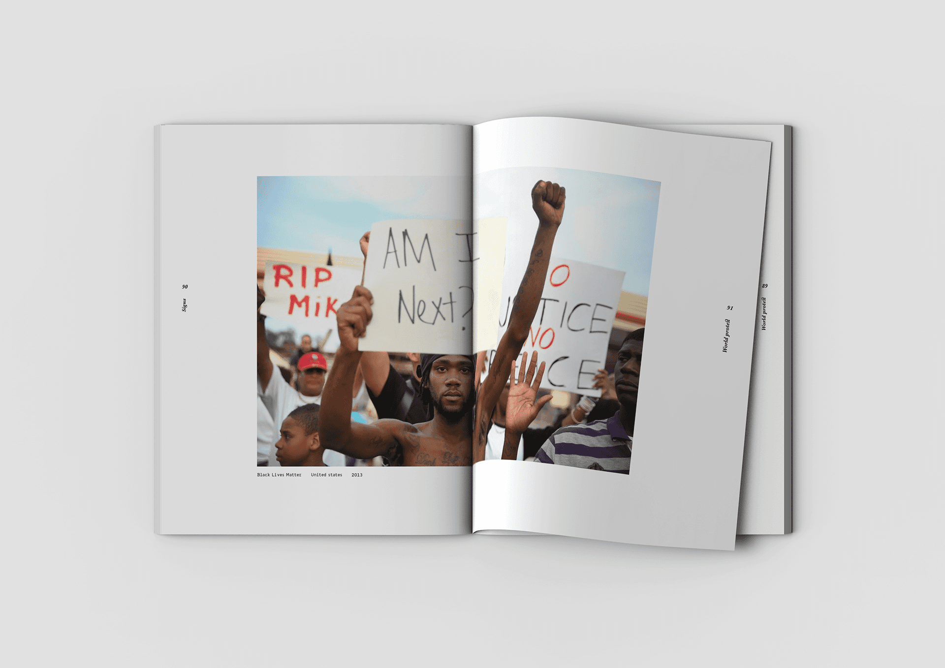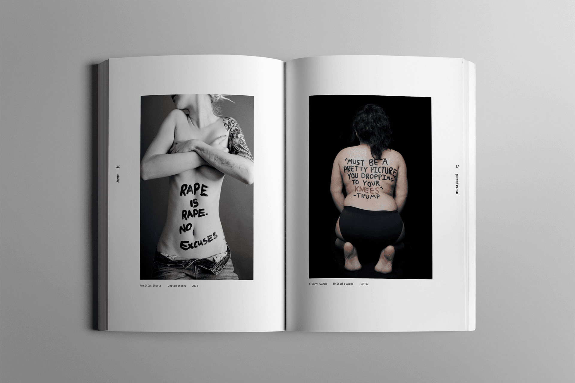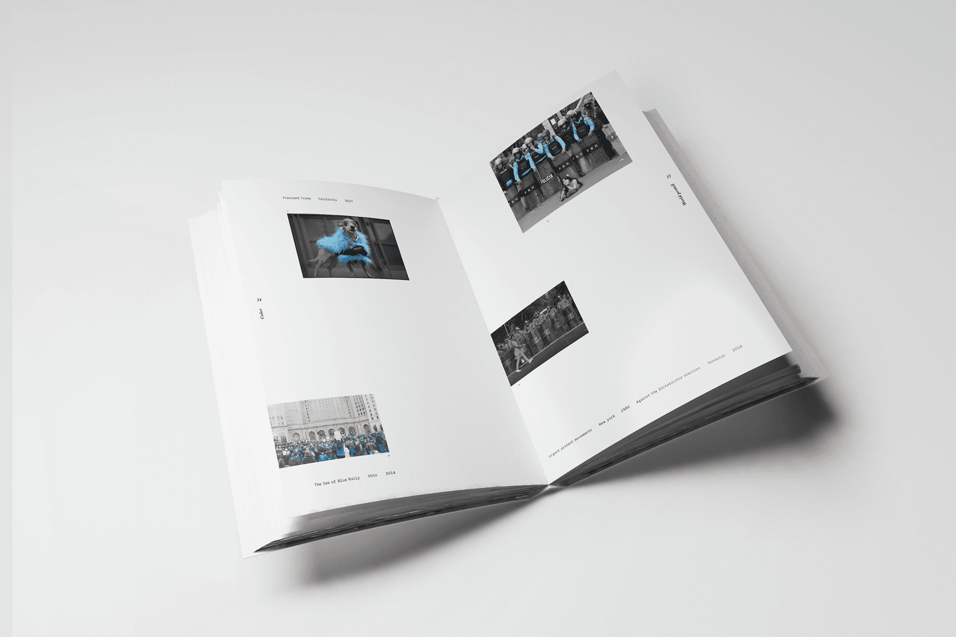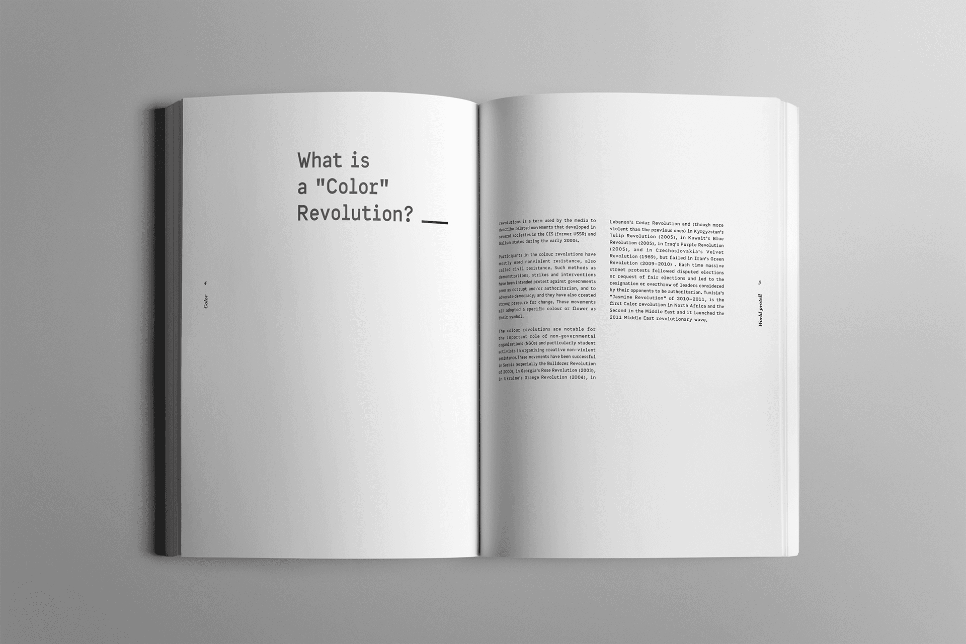 This is a catalog dealing with protests. The catalog is an introduction to the term "protest". The many different shades and layers this term contains. The catalog engages in a trial to see the many shades and layers of the word from the visual point of view. The colors that are bound together on the different billboards exposed in protests. The end focuses on the contrast between the individual as to the masses in a composition.